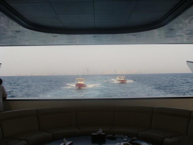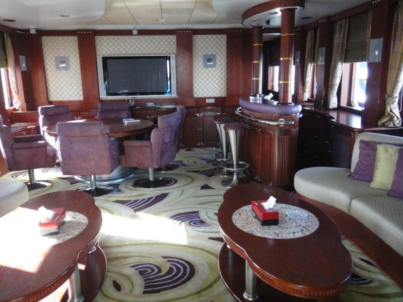 The open plan layout and furnishing of the spacious salon create the effect of a floating Majlis. With large windows on both beams giving her a light and airy feeling. The salon serves as a conversation and recreational area with full media entertainment systems and bar facilities.