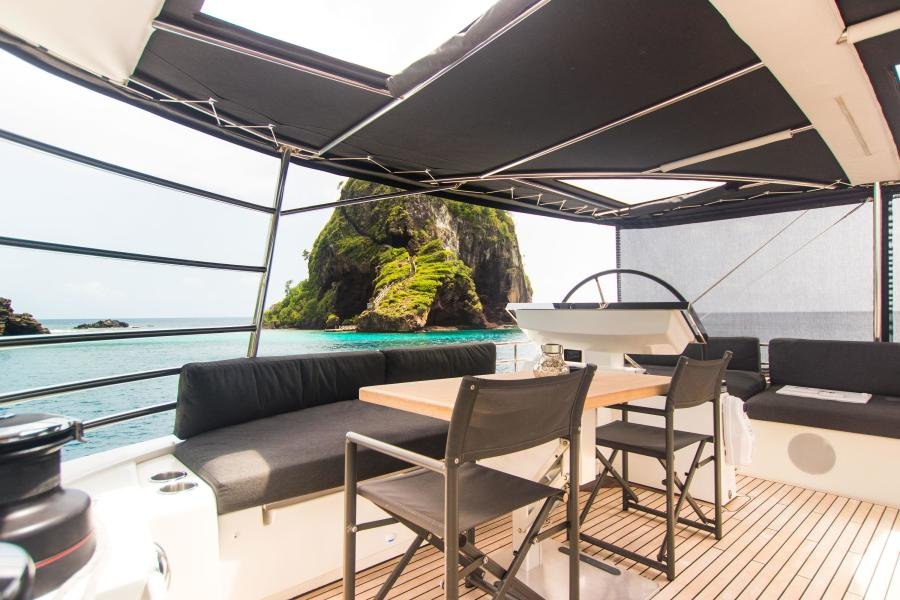 - Cockpit and salon on one level (no steps), creating a seam-less transition between interior and exterior living and entertainment spaces. Further enhanced by the 3-section sliding glass doors which may be fully retracted to create an uninterrupted flow without barriers or constrictions.
