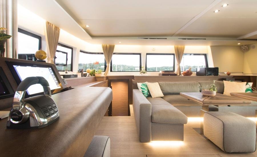 The main salon is spacious and modern, with a large-L shaped settee to port with flatscreen TV at forward end. A second large L-shaped settee is to starboard with 2 tables that convert from low coffee table to a large, tall dining area, seating 8 with 5 additional charcoal stools. The inside upgraded “Caribbean” navigation station is forward. Excellent visibility throughout the entire salon.