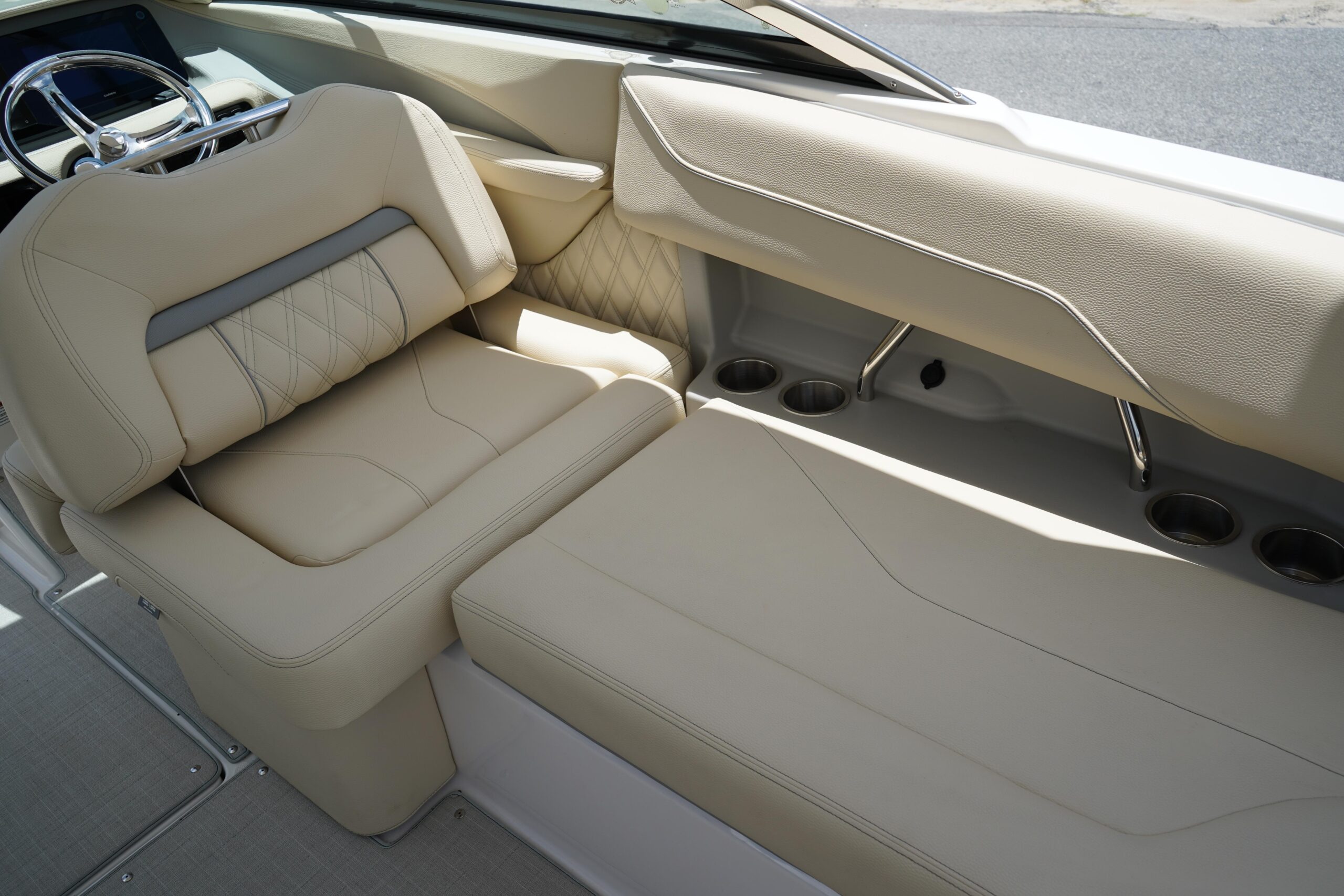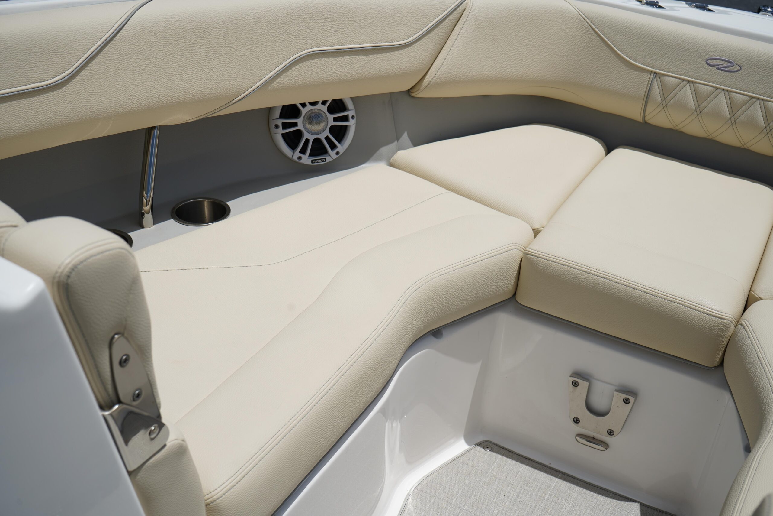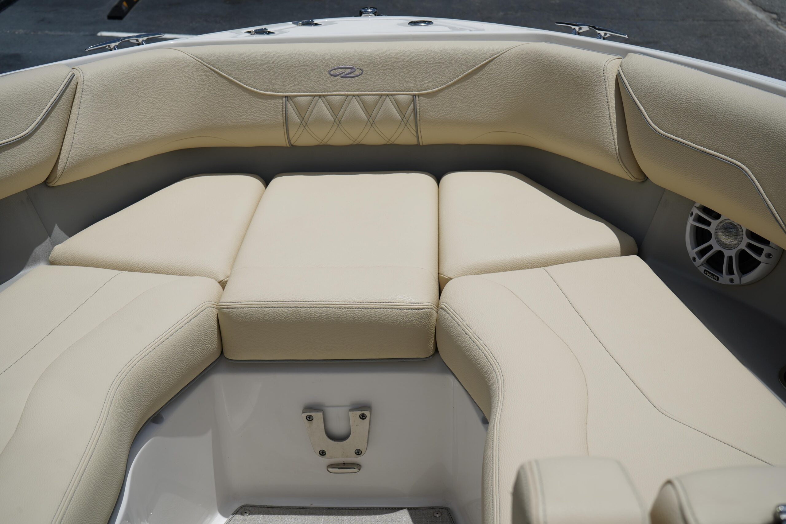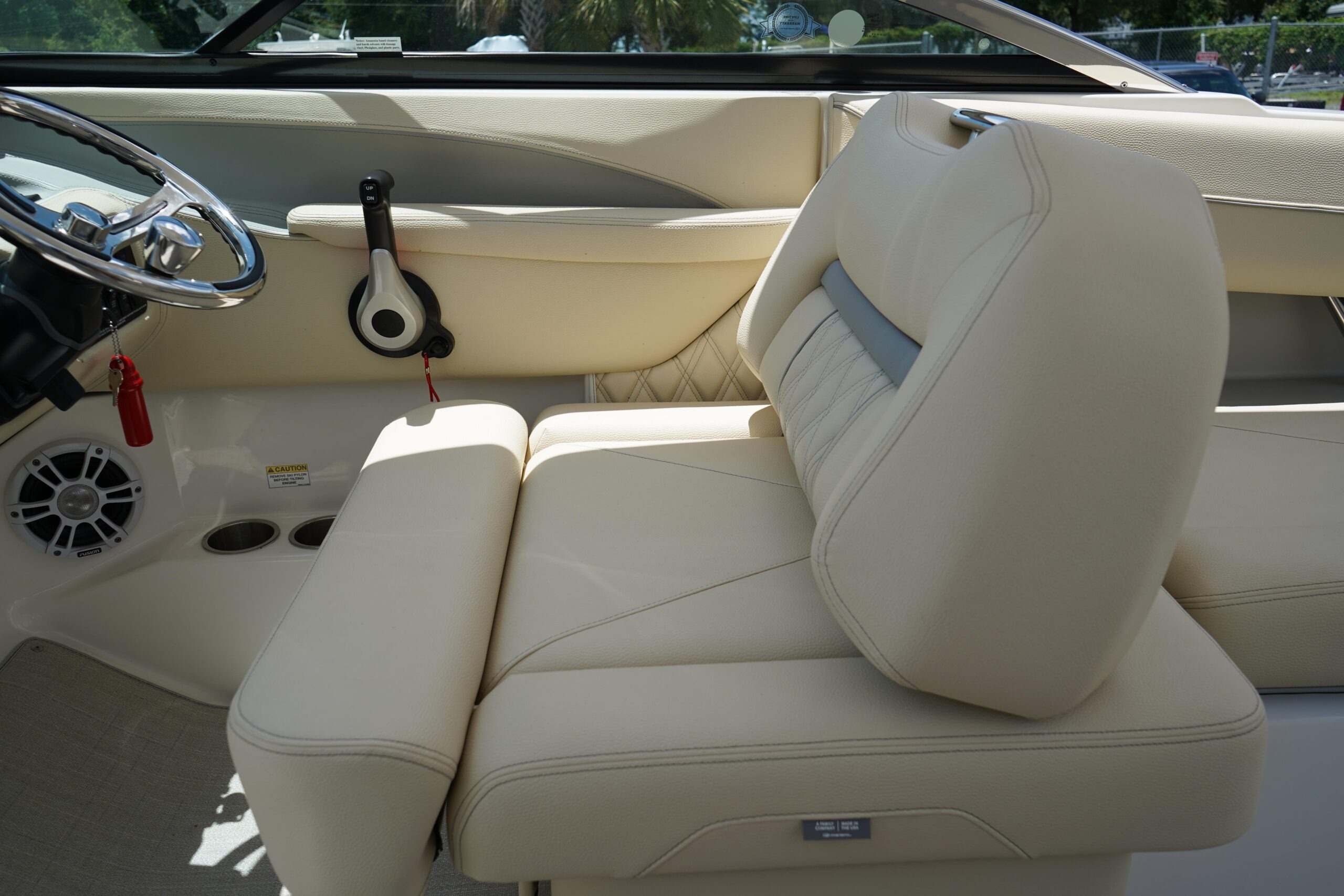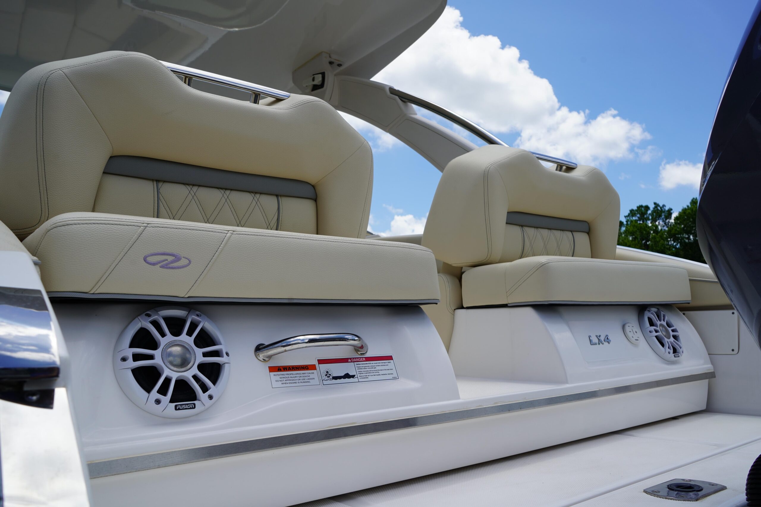 All the bells and whistles – Fusion Stereo System, Twin Garmin displays, trim tabs Snap in flooring, folding hard top.