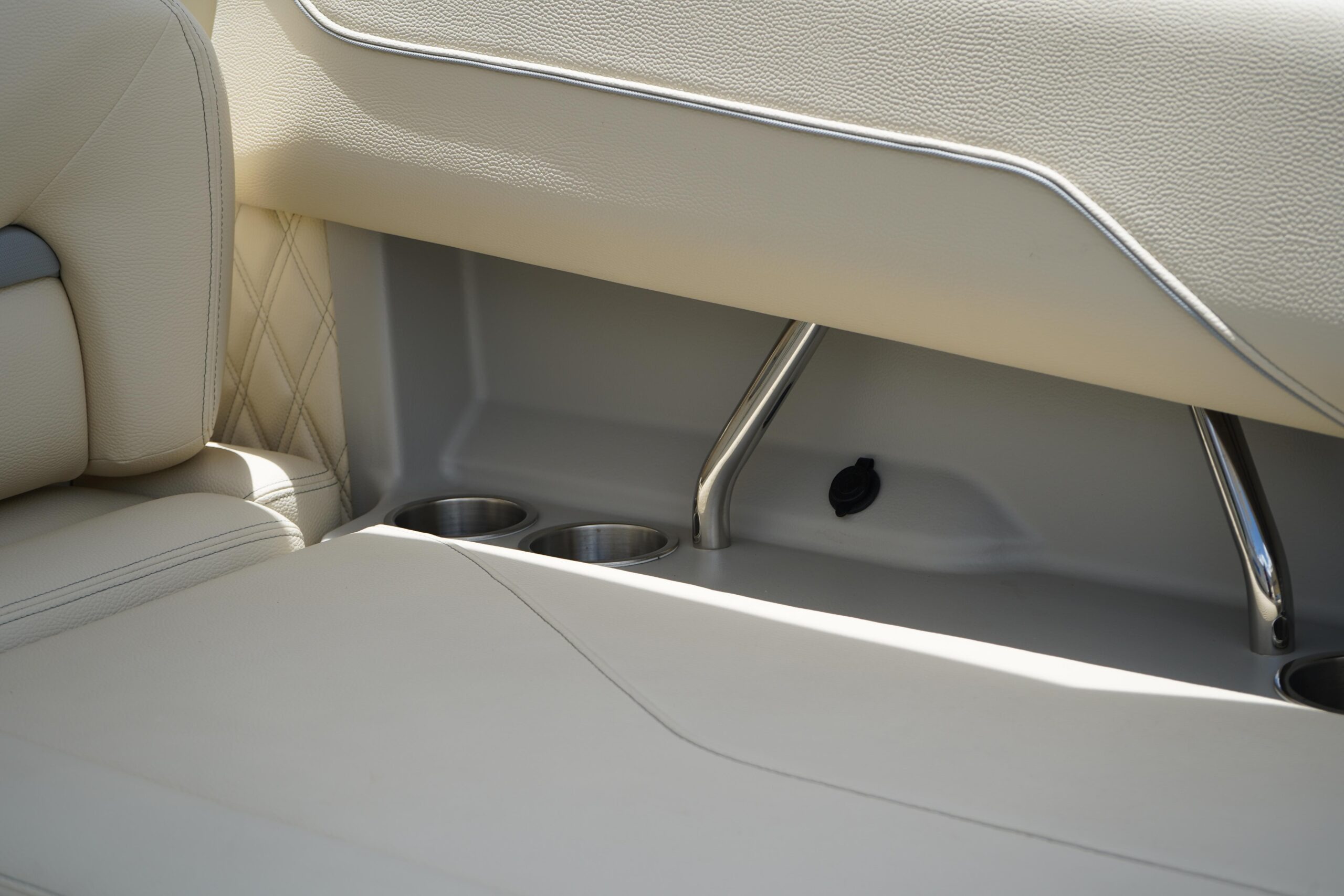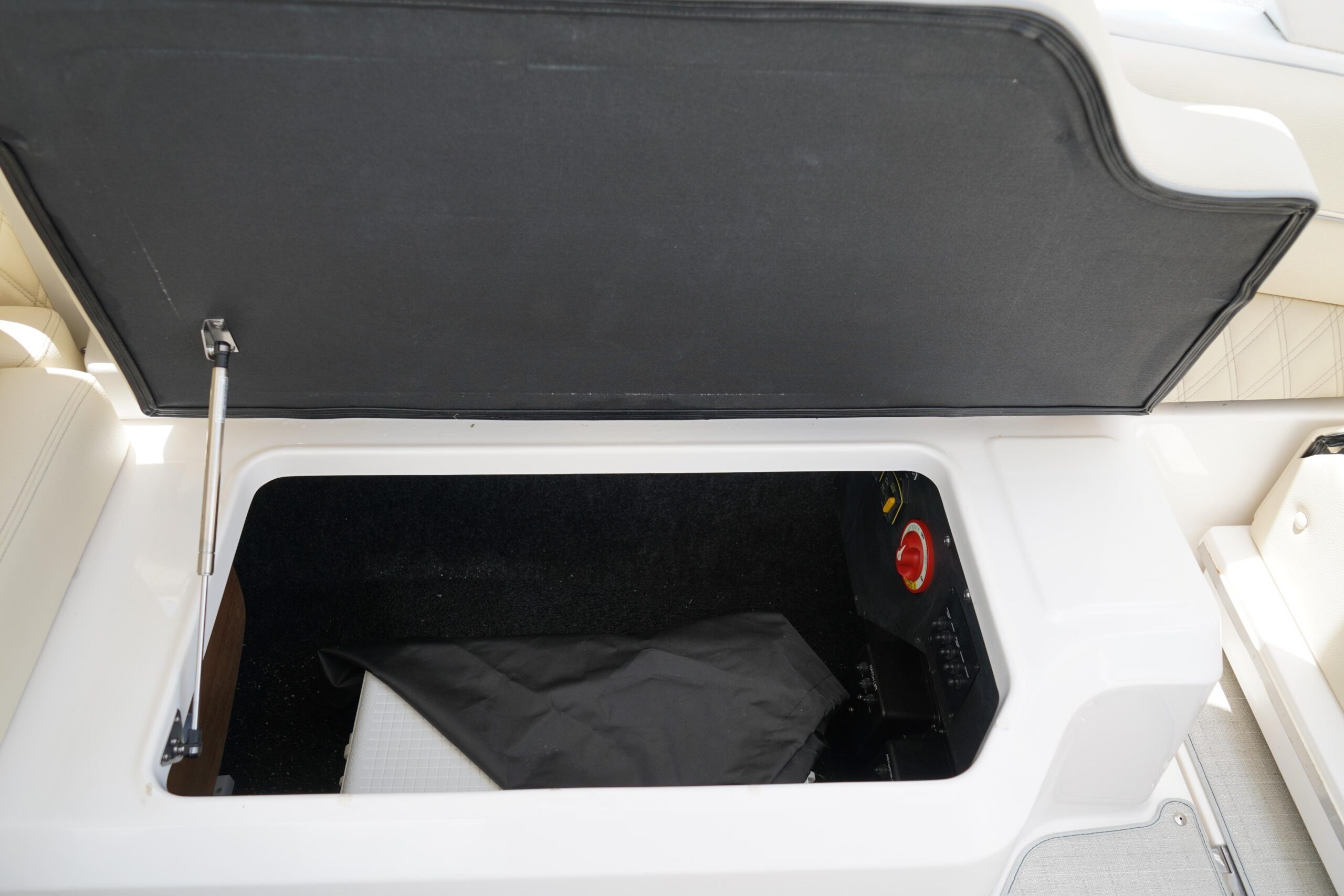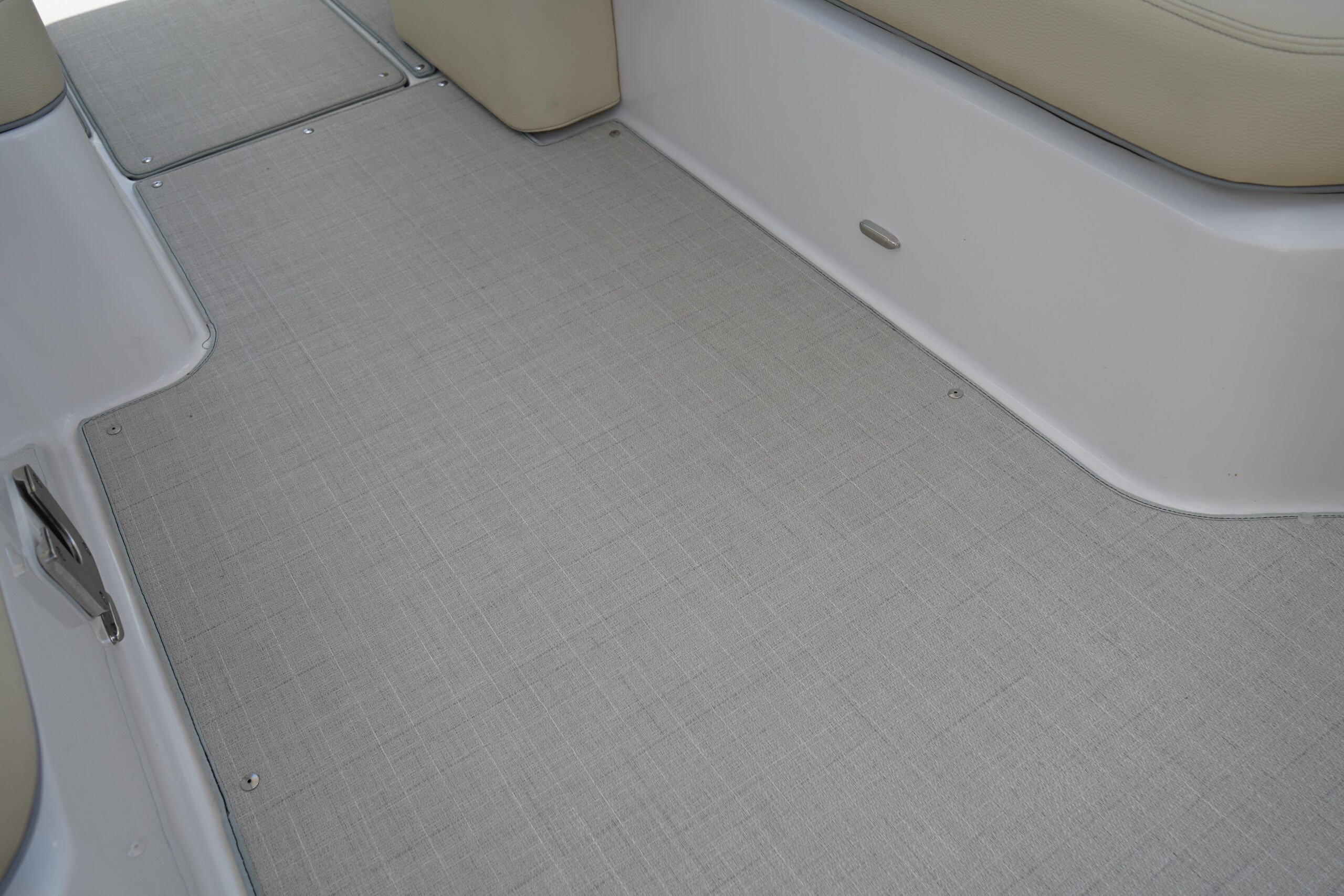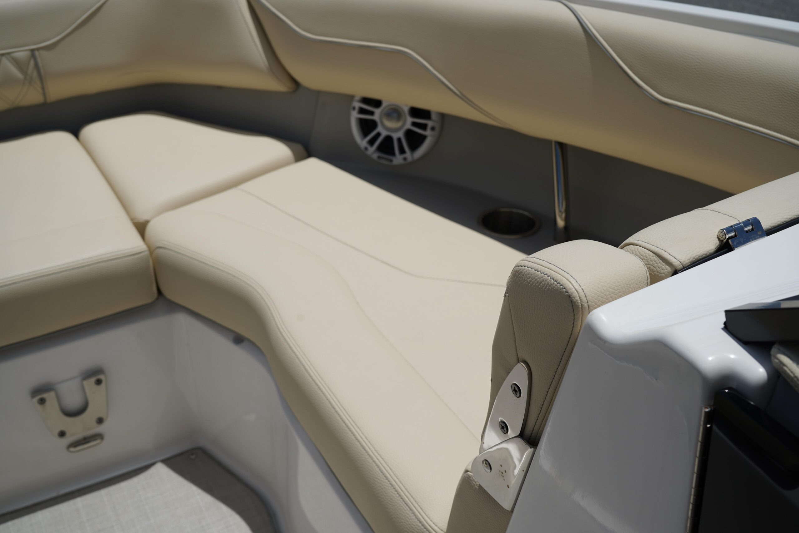 All the bells and whistles – Fusion Stereo System, Twin Garmin displays, trim tabs Snap in flooring, folding hard top.