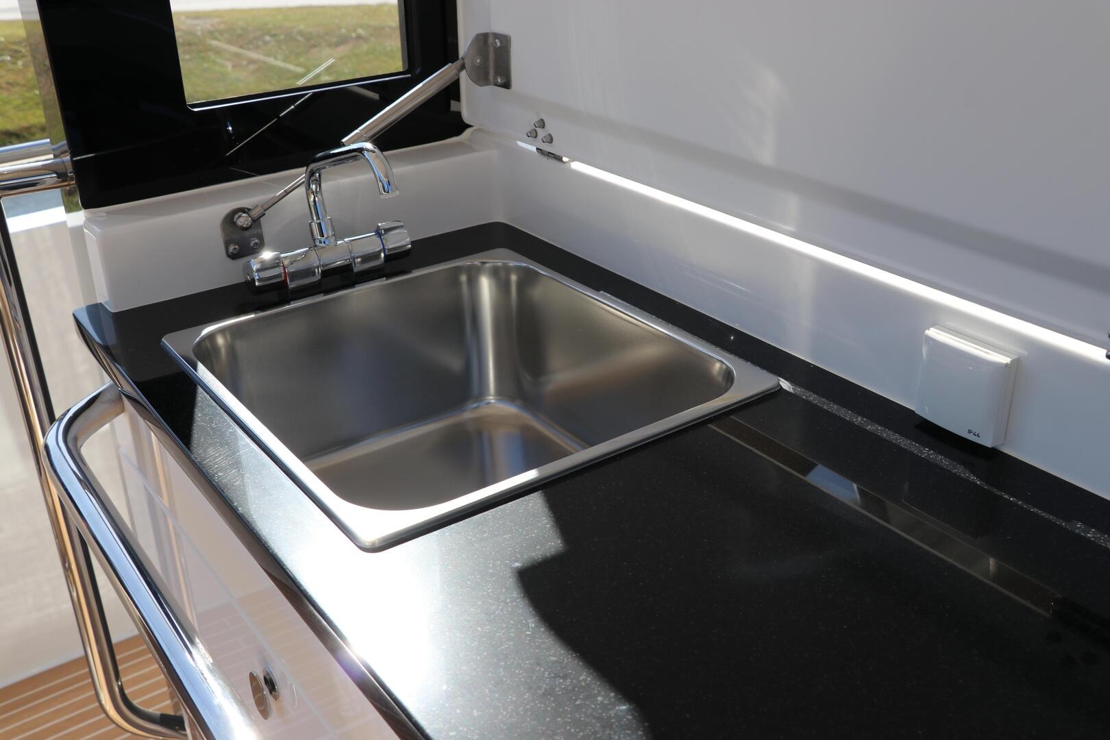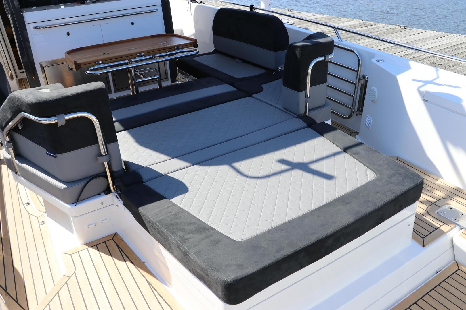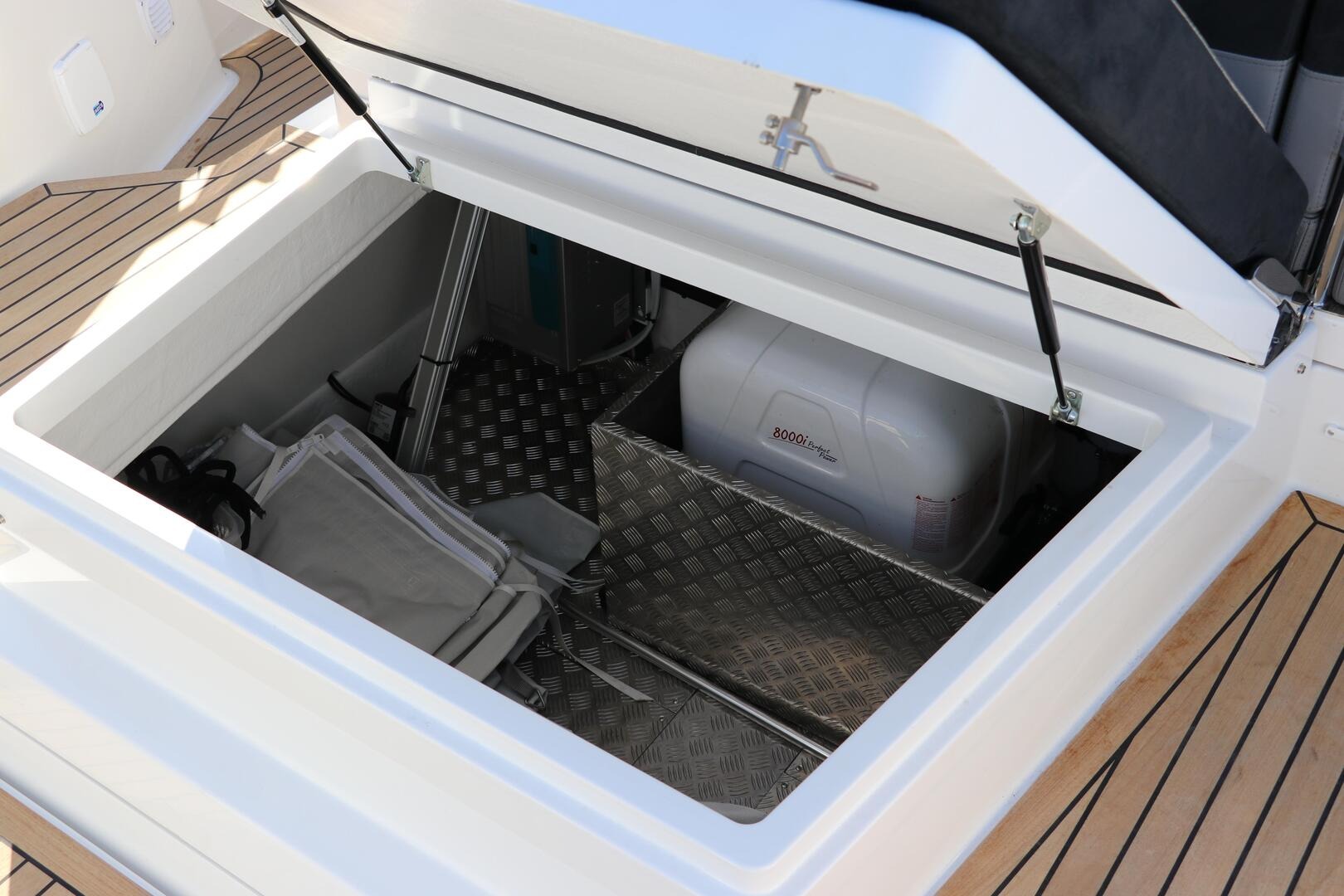 The lounge area has a large table and three sofas which, depending on their position, can function as a large sun pad or a seating area that can either have all seats facing forward or alternatively facing one another. The outdoor galley has drawers for cutlery and tableware, a kitchen sink with hot water, and space for a gas stove or electric grill. The large stowage space measures just over 2500 liters (224 gallons) and boasts a hydraulic opening mechanism that is easily accessible from the aft deck. It has space for everything you could ever want to bring with you, whether that be SUPs, sea bobs, wakeboards or simply an inflatable rubber boat. The swim platform and the aft deck are large and easily provide enough space for several people at the same time.