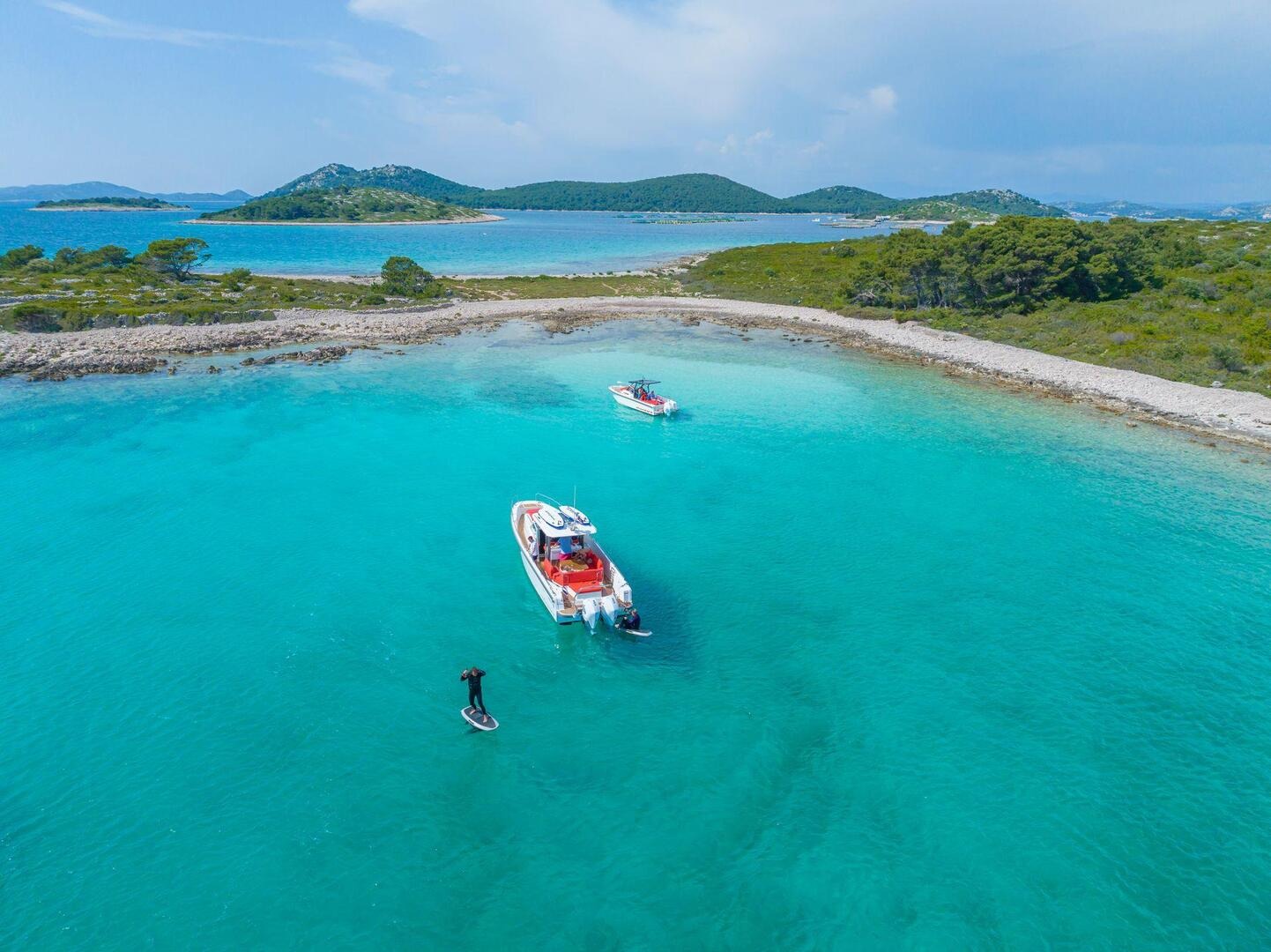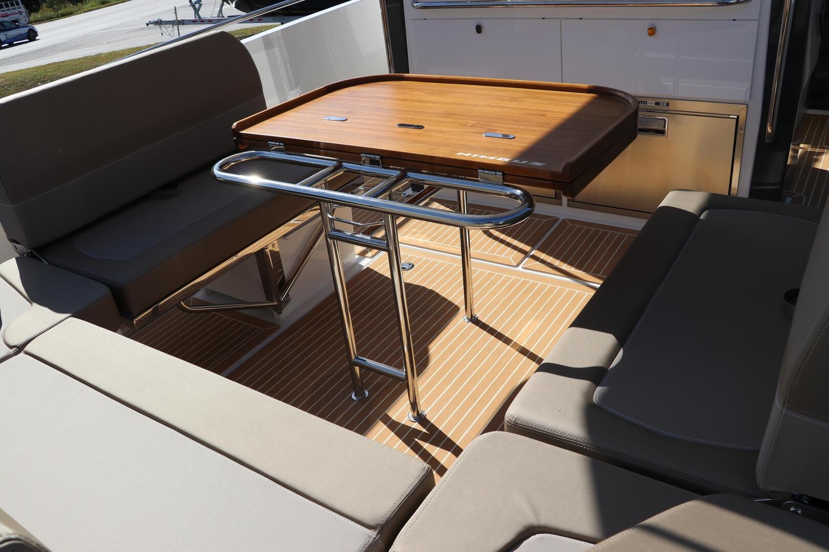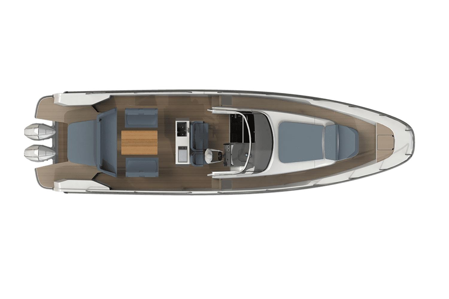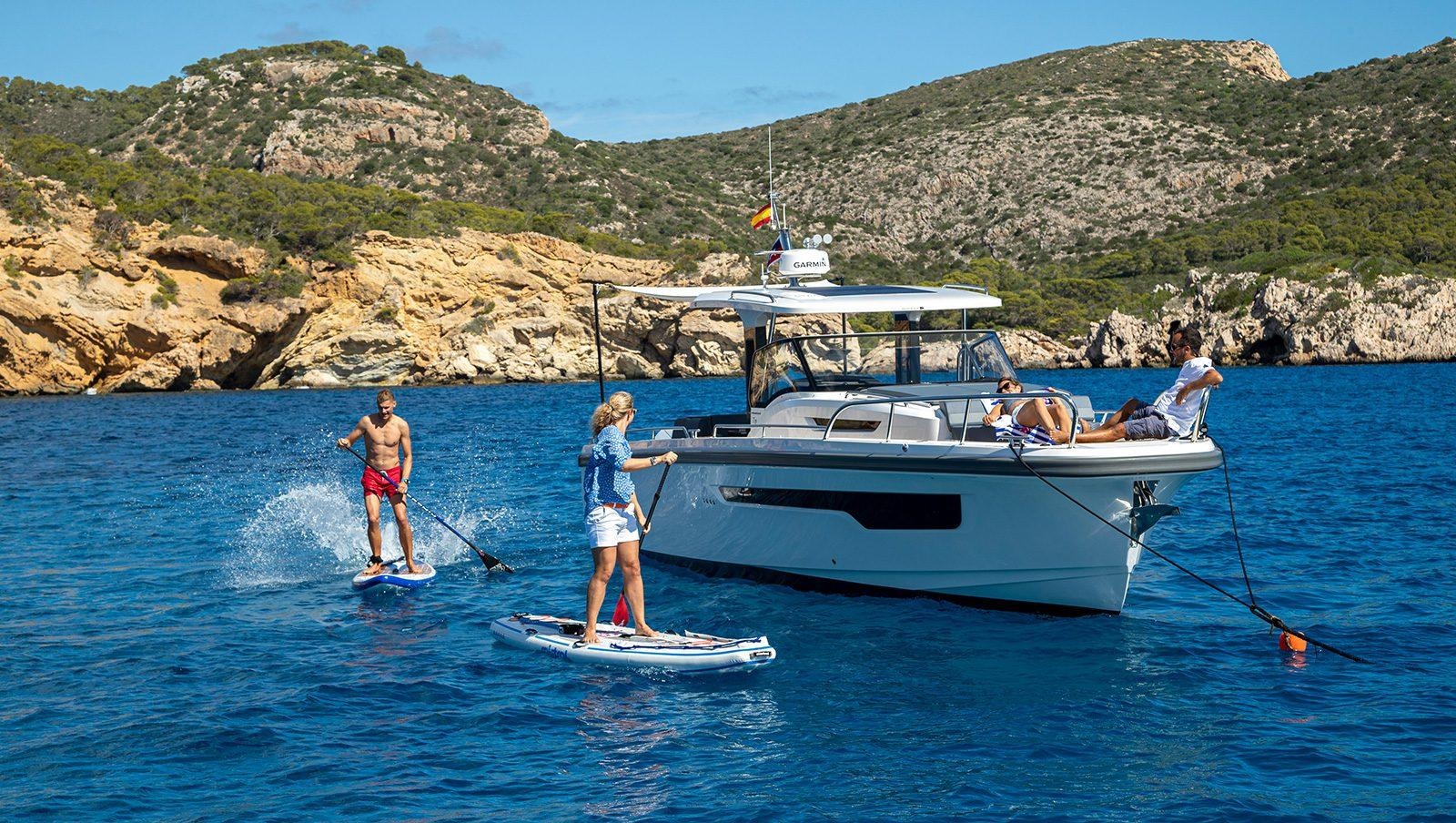 The lounge area has a large table and three sofas which, depending on their position, can function as a large sun pad or a seating area that can either have all seats facing forward or alternatively facing one another. The outdoor galley has drawers for cutlery and tableware, a kitchen sink with hot water, and space for a gas stove or electric grill. The large stowage space measures just over 2500 liters (224 gallons) and boasts a hydraulic opening mechanism that is easily accessible from the aft deck. It has space for everything you could ever want to bring with you, whether that be SUPs, sea bobs, wakeboards or simply an inflatable rubber boat. The swim platform and the aft deck are large and easily provide enough space for several people at the same time.