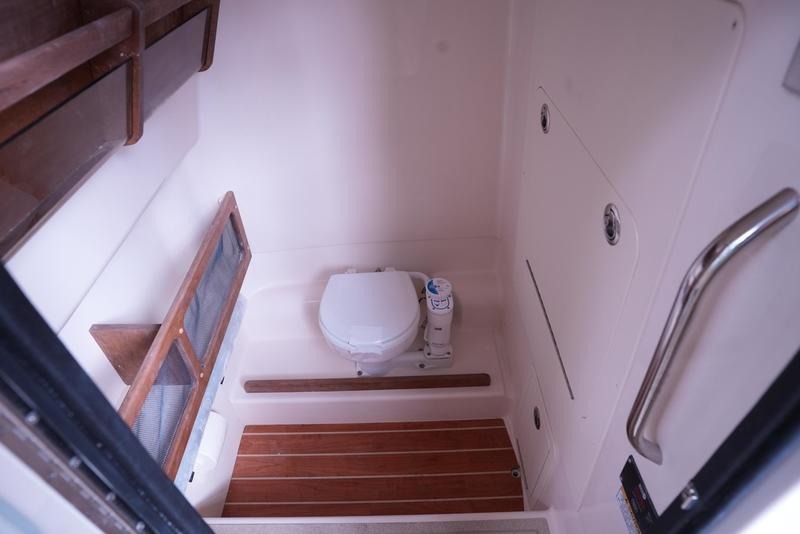 - Head – lockable console w/lighting, bulk storage, composite cherry & holly sole & marine head w/electric flush, 10-gallon (38 l) holding tank w/macerator, overboard discharge & deck pump out