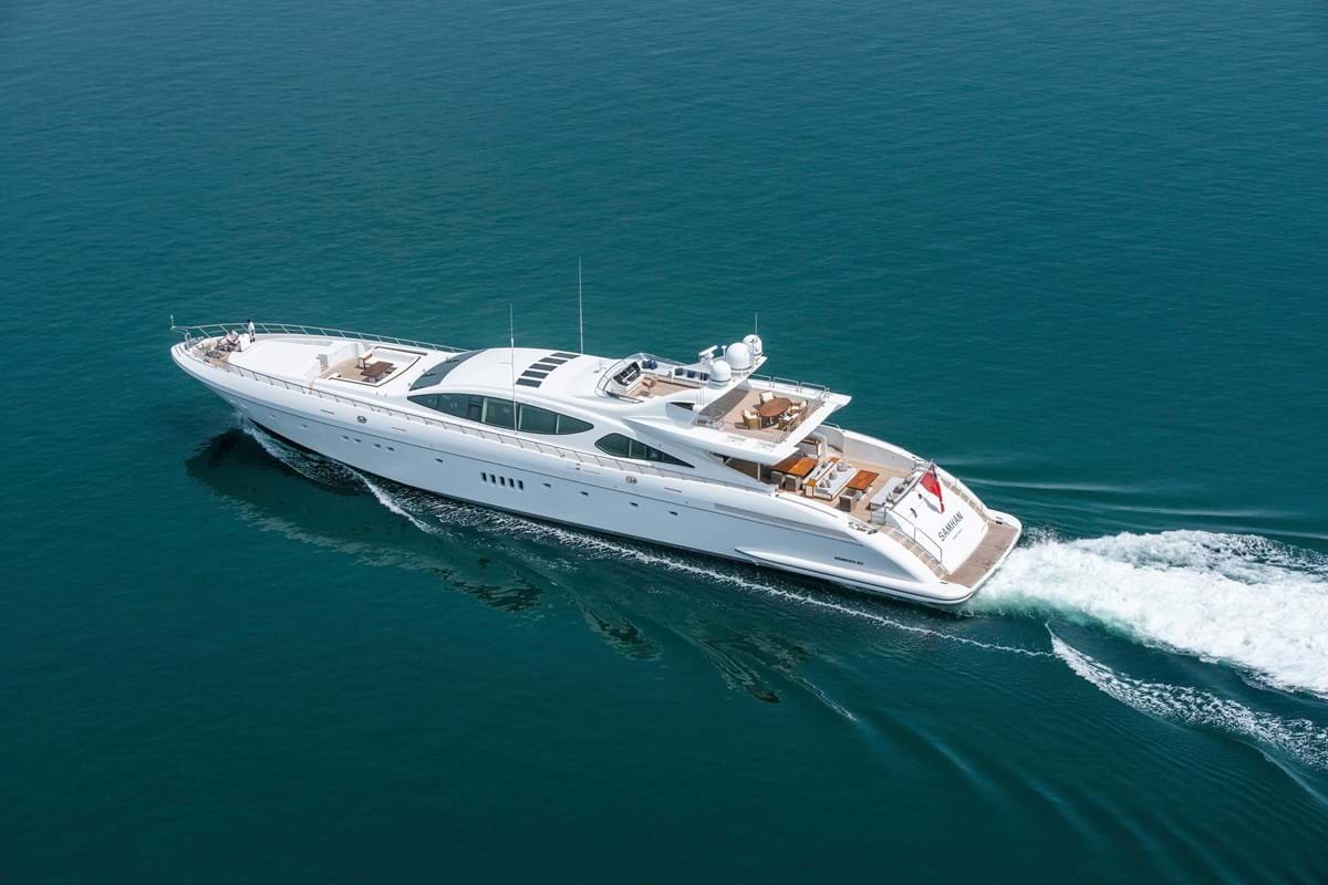 Built by Overmarine in 2007, and the second hull of the famous 165 line, BASH IV combines style, space and speed. Interior and exterior design is by Stefano Righini, with a sophisticated and contemporary flair throughout the yacht. Able to welcome 10 guests, BASH IV has five luxurious en suite cabins, plus accommodation for nine crew. Powered by triple MTU 16V 4000 M90 engines, with low hours, BASH IV clocks impressive maximum speeds of 38 knots, cruising at 30 knots, with a comfortable range of up to 700nm. A very shallow draft of 1.9m ensures access to almost any anchorage.