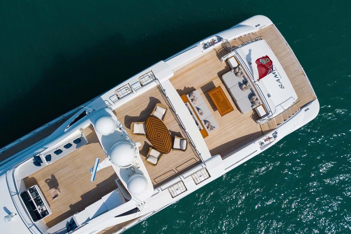 The flybridge is a beautiful hub with a dining table plus more seating and the control systems further forward. The main saloon leads directly out to the expansive open aft deck, which features a serving bar and full dining table for up to 10 guests with an extendable table to use when hosting larger groups. This space connects directly with the swim platform, the forward lounge and dining area on the bow. The tender garage holds a 6m Castoldi Jet tender, two Sea-Doo RXT jetskis and other watersports equipment.