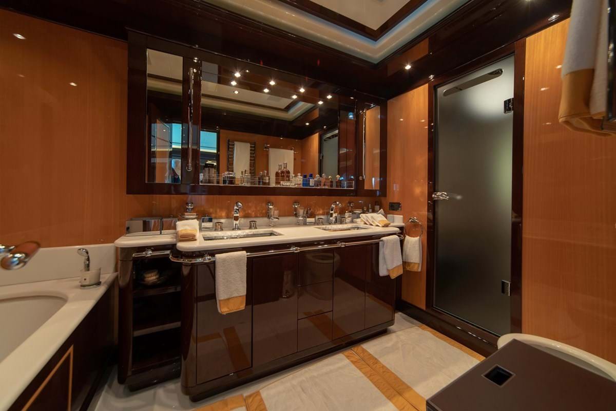All guest cabins are positioned on the lower deck, including the four VIP cabins and full beam owner’s suite with forward facing king-sized bed, office and his and hers bathrooms. Guest accommodation is accessed via a staircase aft of the wheelhouse, ensuring high levels of privacy. The large and inviting main saloon, with an open plan layout, is located on the main deck. Relaxed lounge seating, a bar and newly upgraded entertainment system make this the perfect space to socialise and entertain. Further forward on the main deck is the fully equipped wheelhouse and ship’s office. A special feature, located forward of the lower deck, is a unique cinema room, big enough to accommodate all guests for movie evenings.