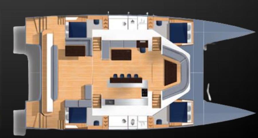 • Double bed 150 x 200 with access from both sides in the aft cabins and access from one side only in the other two cabins