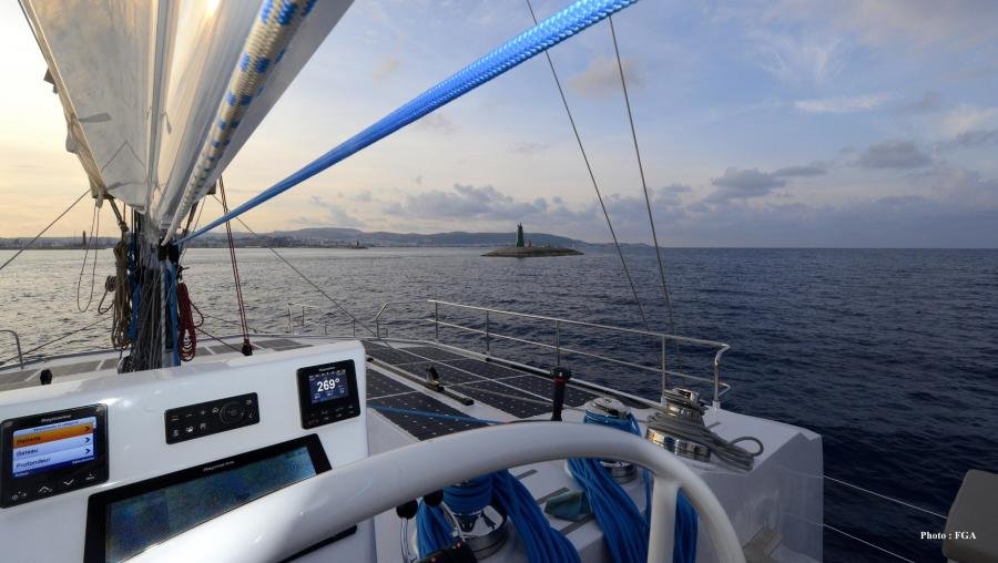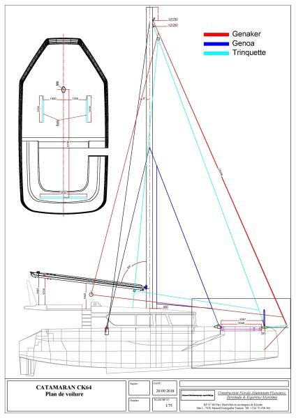 • Fully battened mainsail of 120m² Antal double ply, Dacron, 3 reefs and anti-chafe strips