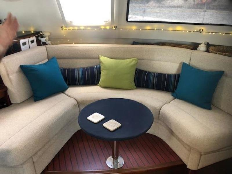 S/V Delphine offers outstanding levels of living space and absolute comfort, making her ideal for extended cruises with large families or groups. Expansive panoramic windows in the spacious saloon flood the interior with natural light. The enormous galley features double stainless-steel sinks, dishwasher, fridge/freezer, Wine Cooler, Ice Maker, Whirlpool 4-burner propane stovetop and an abundance of storage. All this and still allowing plenty of room to move around.