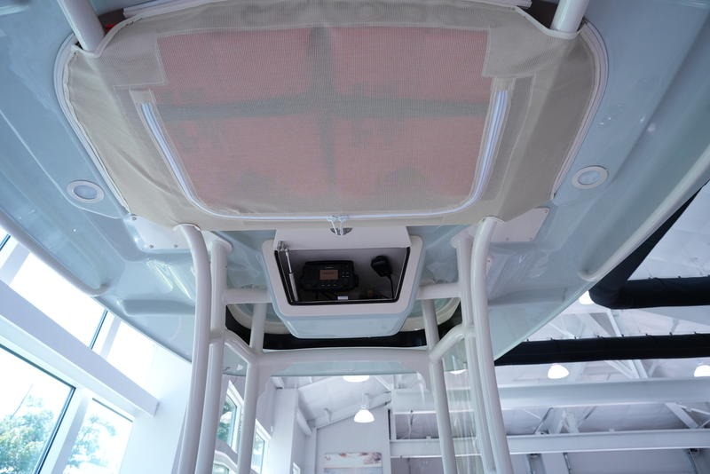• T-top w/painted aluminum frame, storage net, LED spreader lights, rod holders (4), tri-colored (red, blue, white) LED recessed lights (3) & radar flat