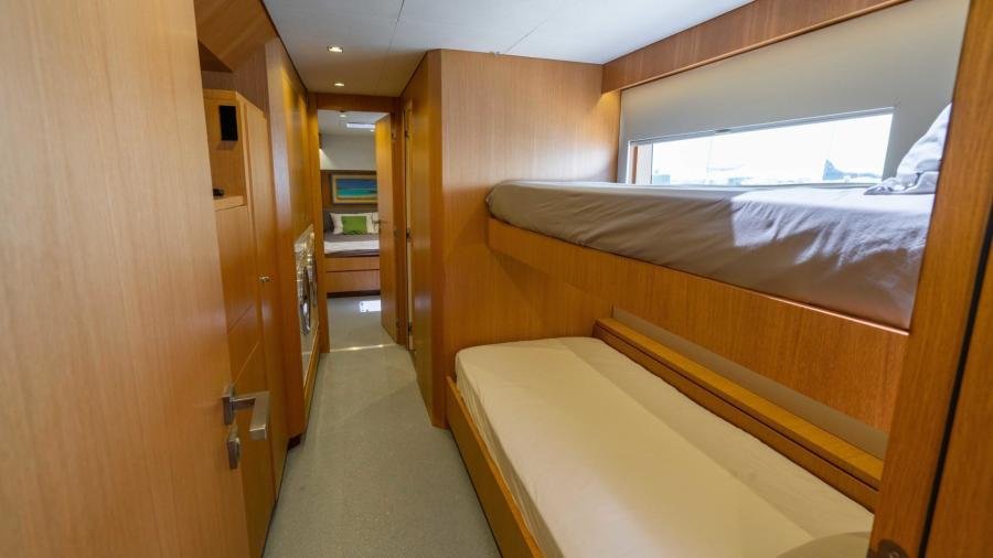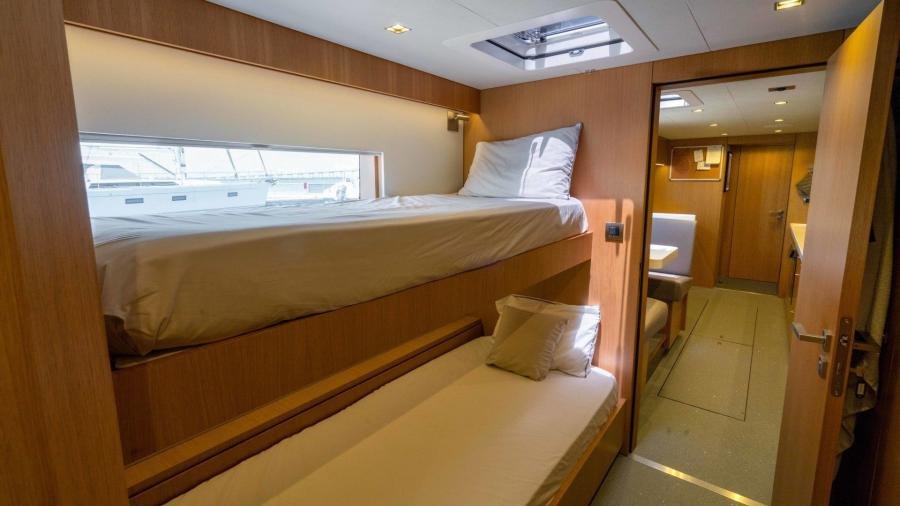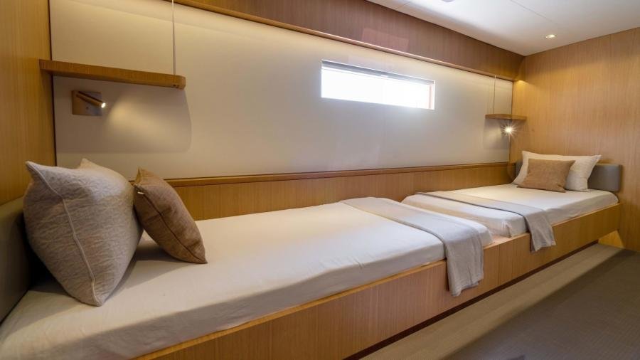 The port hull accommodates the owner’s bathroom, a children’s cabin with 3 beds, together with a guest cabin aft. The aft section of the starboard hull accommodates the 4th guest cabin. The forward section is dedicated to the crew with the captain’s cabin, a double cabin, and large galley with crew mess.