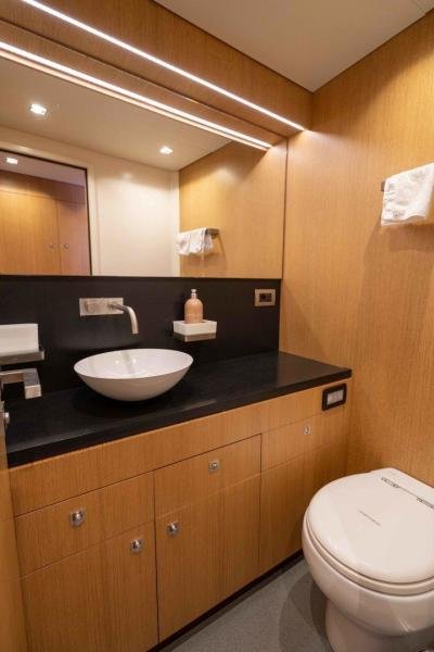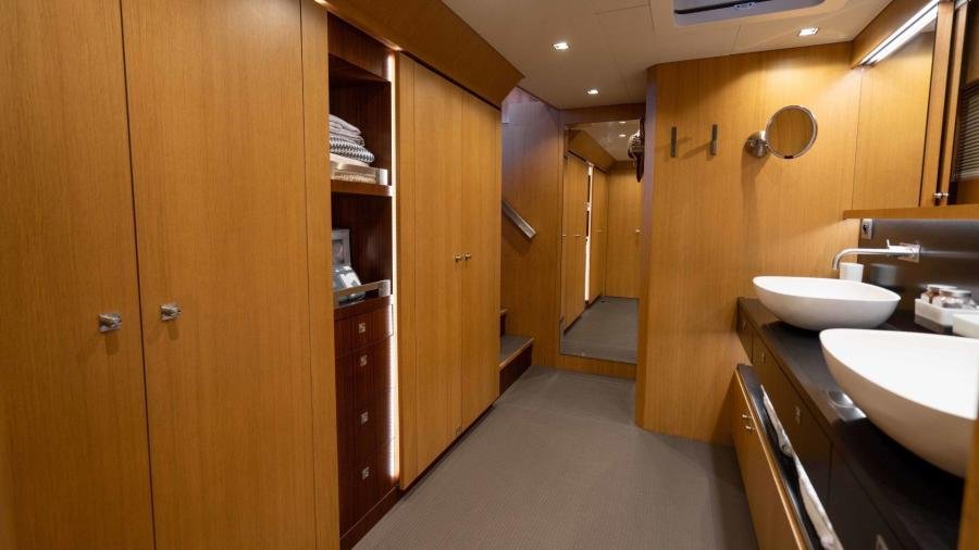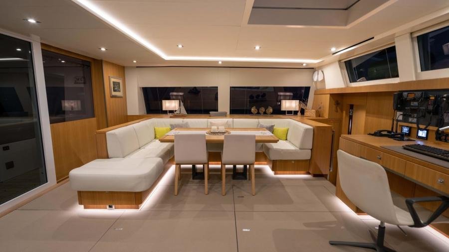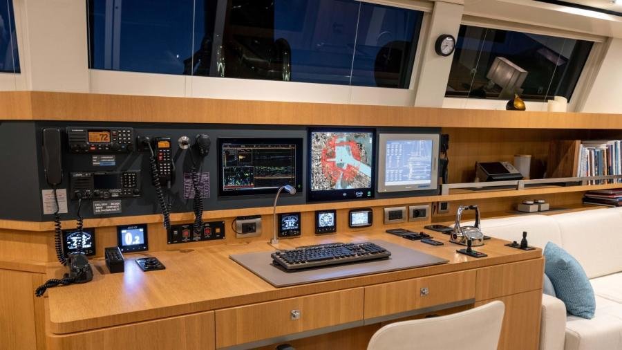 The cockpit flows into the huge main saloon, with a bar on starboard and a more formal dining area on port side. Forward is the chart table which includes all the navigation equipment, significantly upgraded for global exploration by the owner, together with entertainment and excellent communication systems which allow for long stays on board.