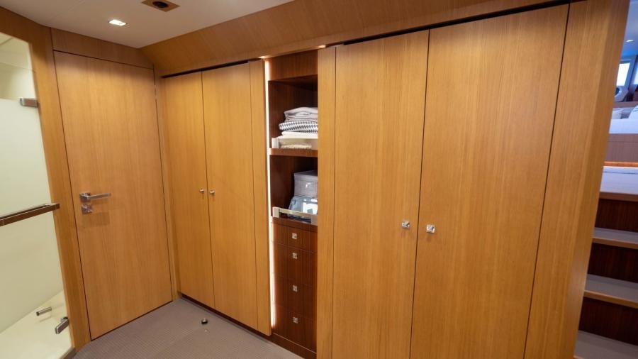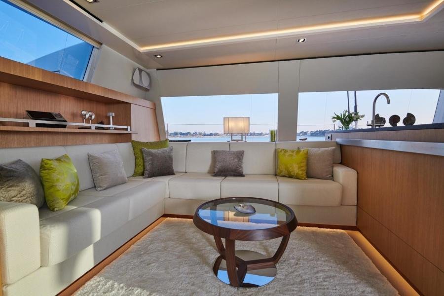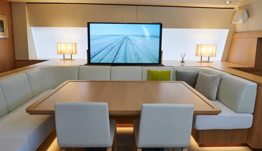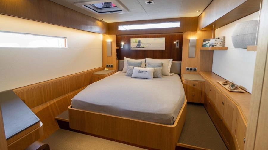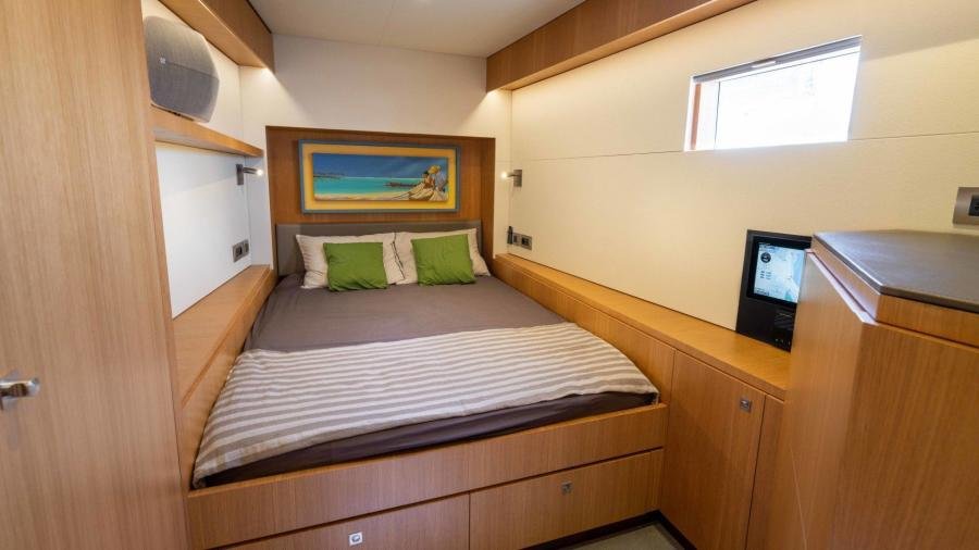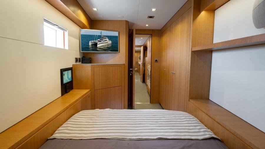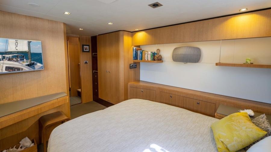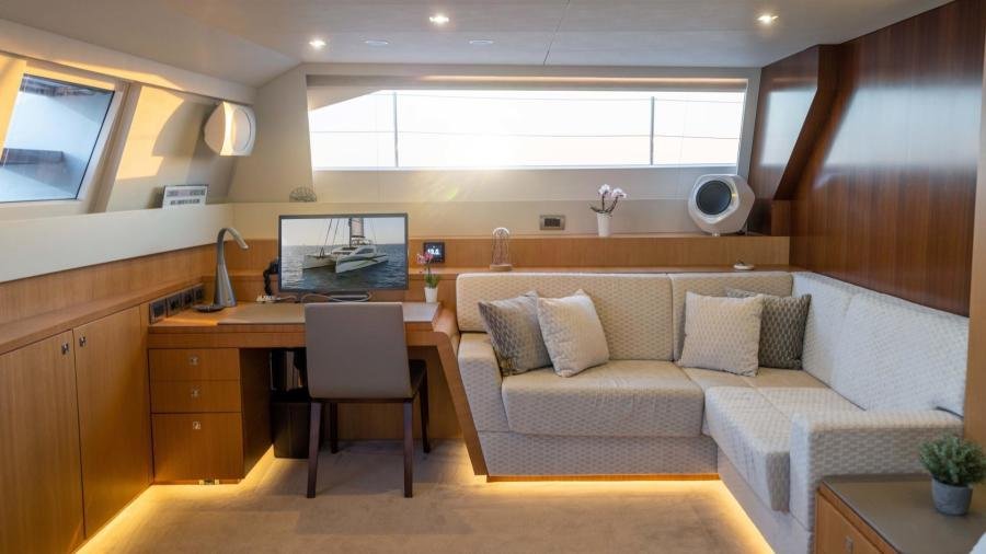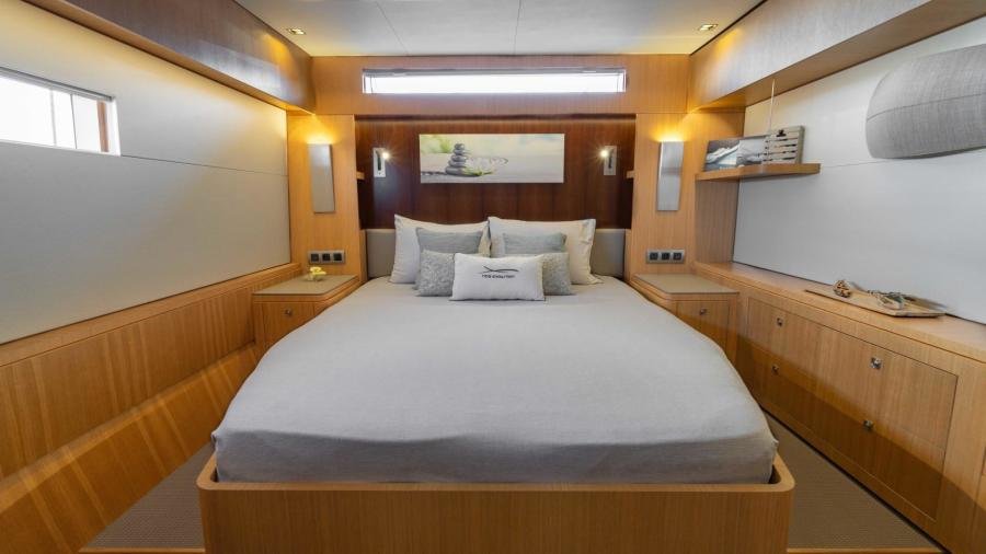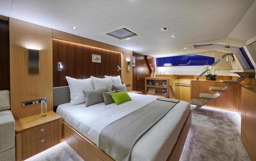 The owner’s cabin occupies the entire beam of the boat, including a lounge area and large windows which flood the room with light and allow for splendid panoramic views as well as private access to the foredeck.