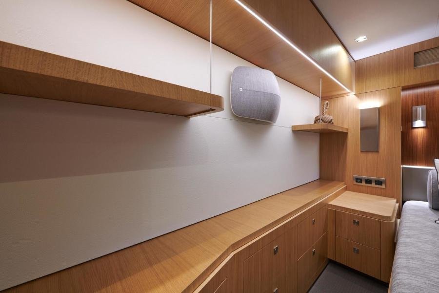 Equipped with a carbon mast and boom, NDSE features a sail plan tailored for high-performance sailing together with hydraulic fittings on the flybridge which ensures she is easily handled, even with a reduced crew. Externally, the yacht offers a large aft cockpit with a relaxing seating area on starboard and a dining table on the port side, together with large sunbathing areas and a daytime toilet. In order to limit the overall weight of the boat, the use of teak was limited to the deck forward of the owner’s cabin, the aft cockpit, and the flybridge.