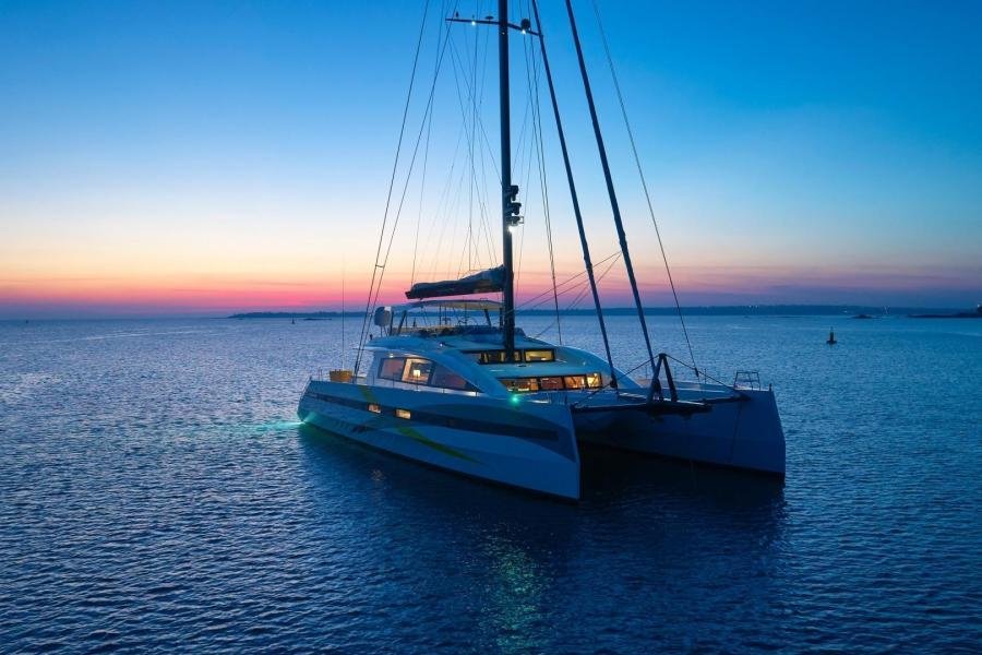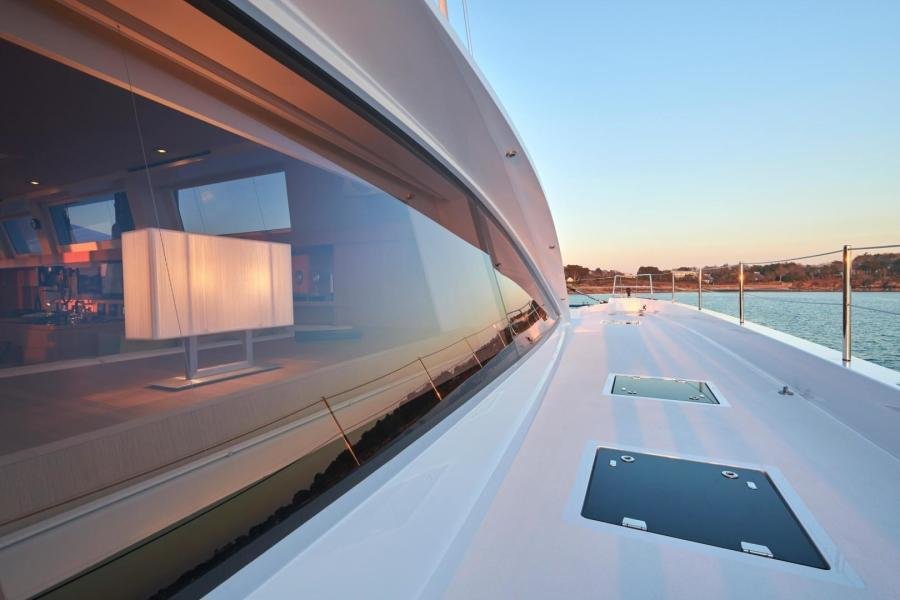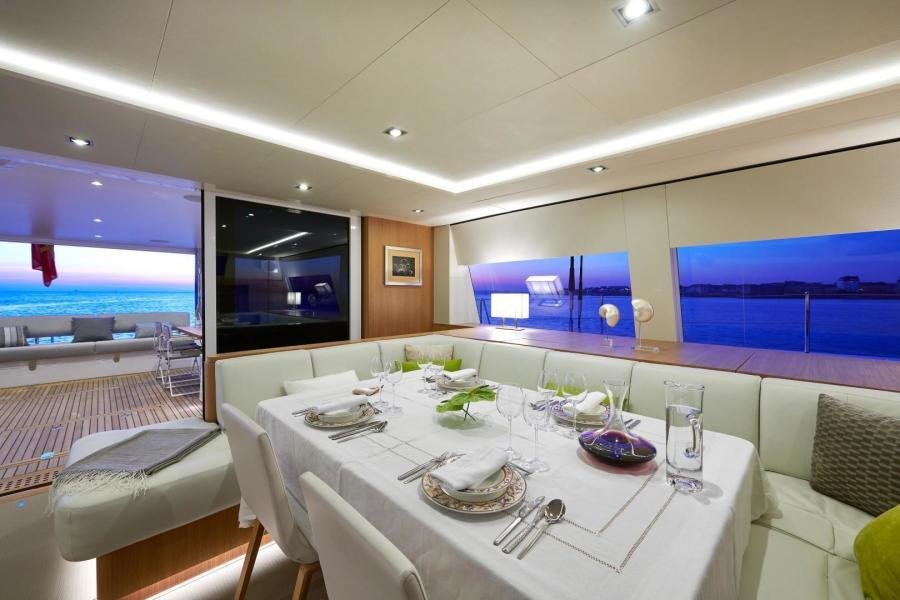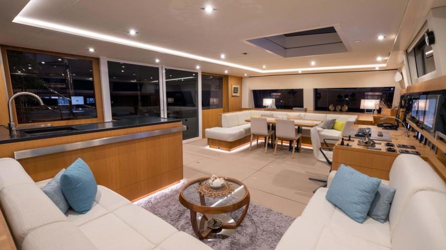 NDSE is this second hull in the Long Island 85 series and incorporates the main characteristics of Hull #1, namely an aluminium hull with superstructure made of composite. In their constant search for weight reduction , JFA Yachts paid particular attention to the use of light materials, including laminates on honeycomb cores, for the construction of the interior. This resulted in a lightship weight of only 56T for this 85′ performance, cruising catamaran.