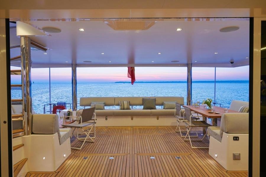 Delivered in 2018, NDSE was designed for circumnavigation through both poles, and has already been taken to Antarctica by her current owner. The flybridge and the cockpit can be fully enclosed and heated offering a comfortable space and the ability to enjoy the sublime but cold landscapes of the poles. Additionally, the flybridge accommodates the outside helm station and the winches as well as a lounge and sunbathing areas.