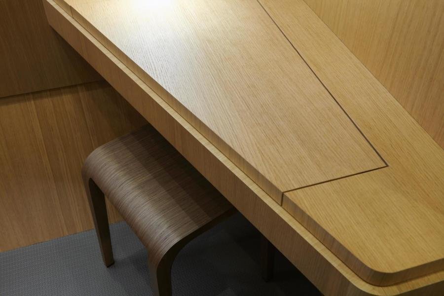 French interior design house, Darnet Design, created a sophisticated yet understatedly elegant interior using natural tones. The furniture is in oak, contrasted by the addition of walnut with the space enhanced by the addition of multiple soft furnishings in bright colors to lift the entire space to another level and also allowing for an element of customisation by the new owner.