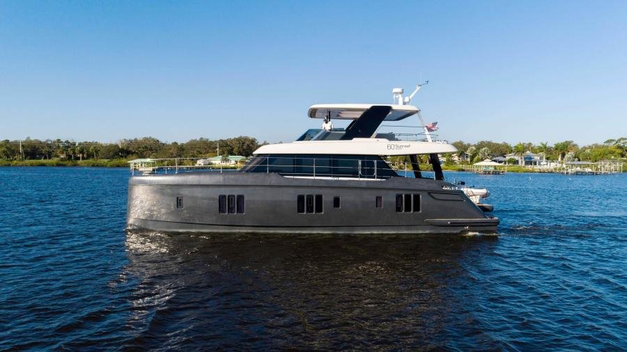 The MC60 wide saloon offers a versatile and spacious living area that, with large windows running the full length of the hulls and retractable glass doors to aft,