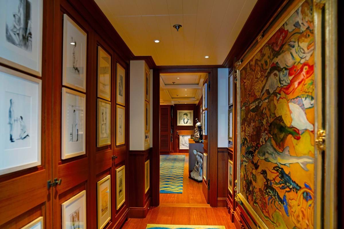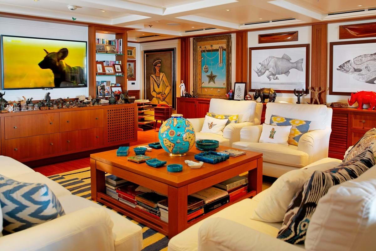 She welcomes up to 14 guests in eight cabins with two single cabins for secretaries or security staff. The owner’s suite, forward on the main deck, has access from the lobby and from the deck. It features a private office, bedroom, walk-in dressing room and a marble bathroom with a rain shower.