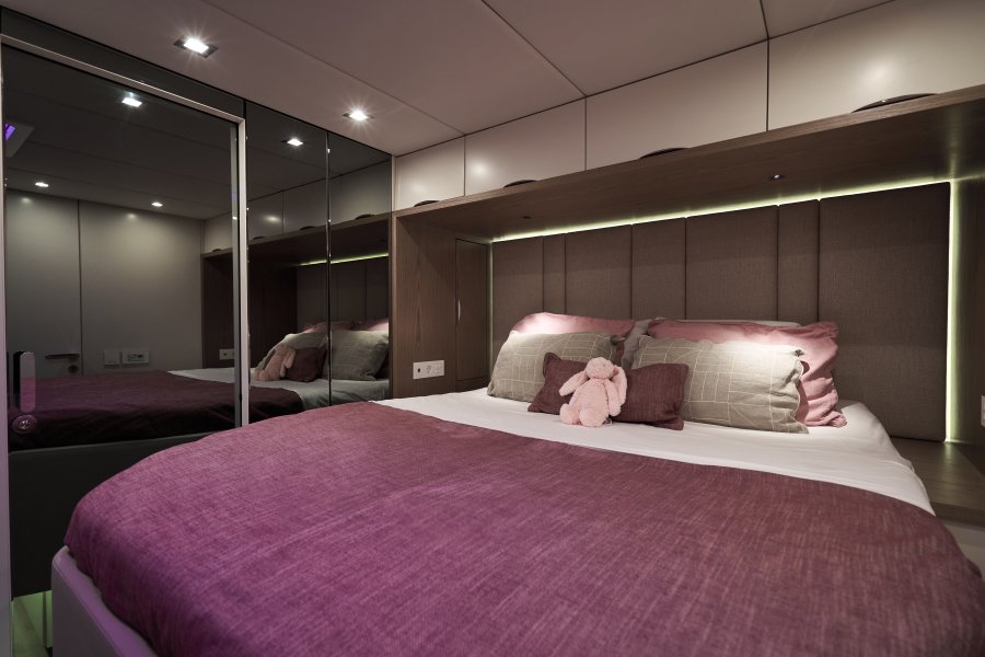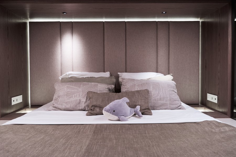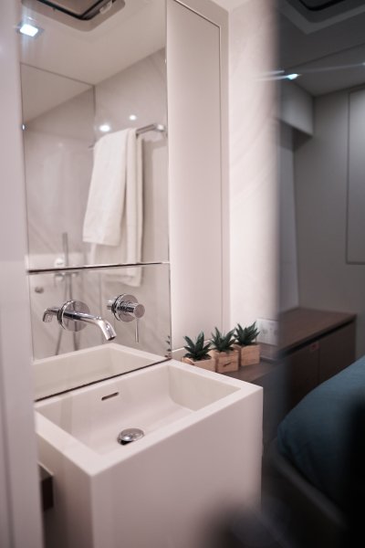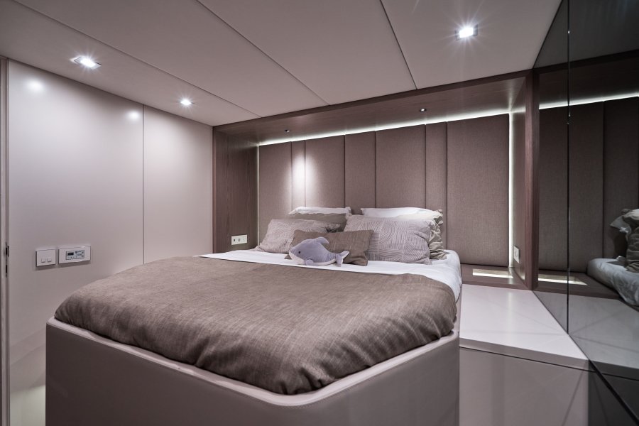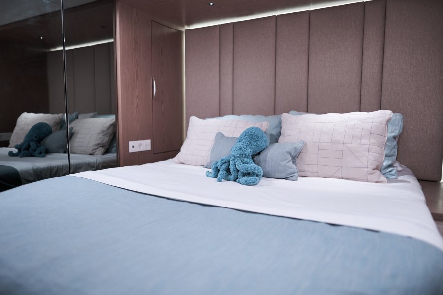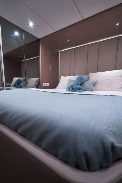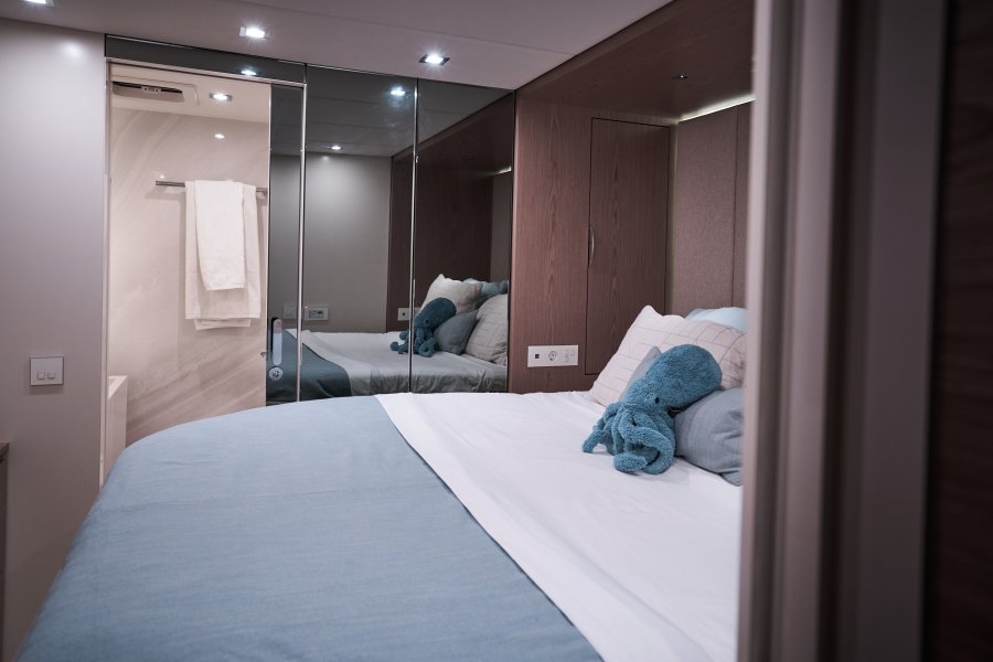 Her layout is perfect for chartering up to 8 guests + 3 crew or large live-aboard families, comprising of 1 Master cabin, 3 guest cabins, and a crew cabin, all en-suite with beautiful finishing. An air conditioned bow crew cabin permits a 3rd crew member.