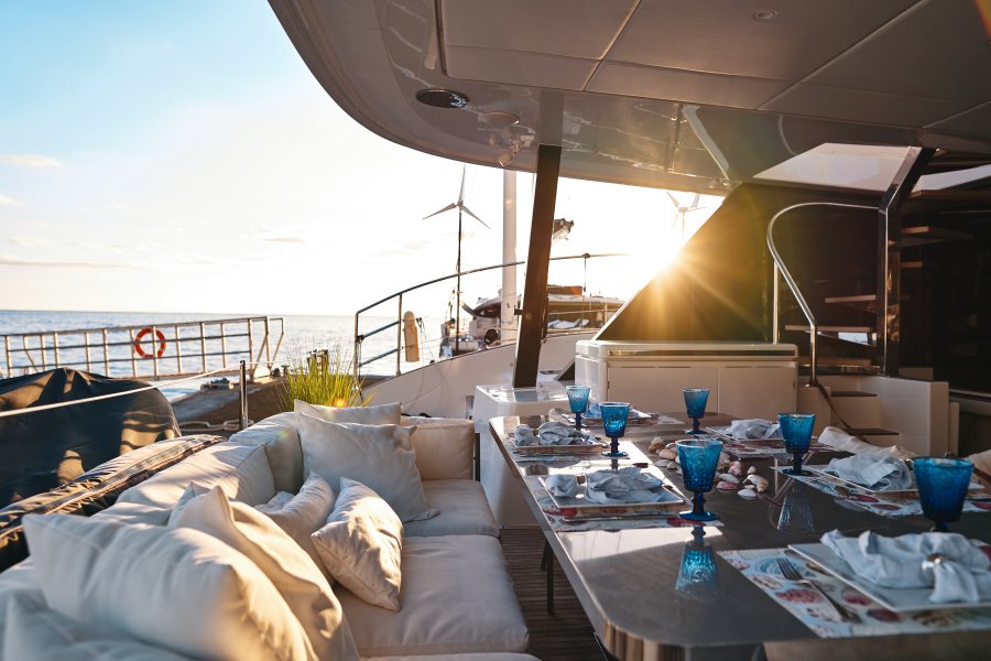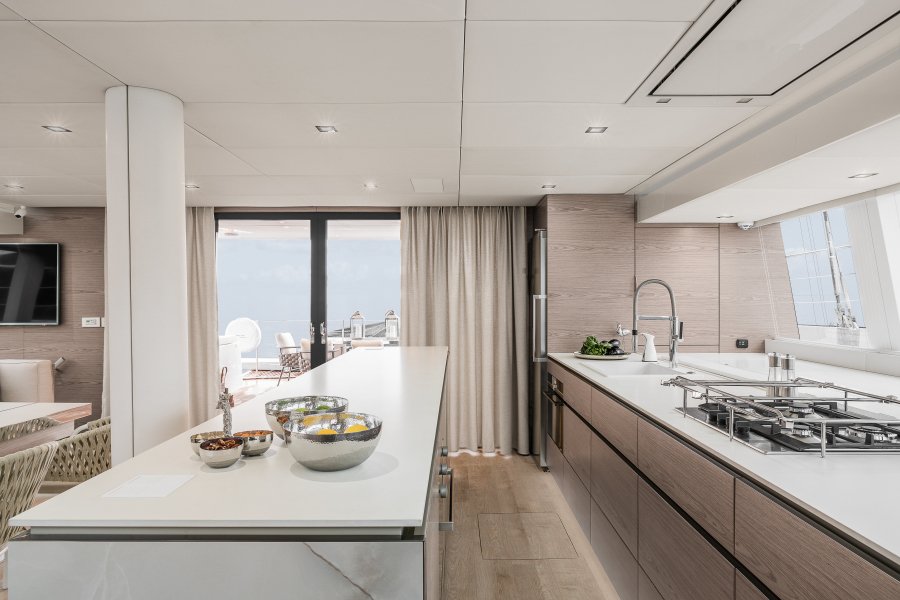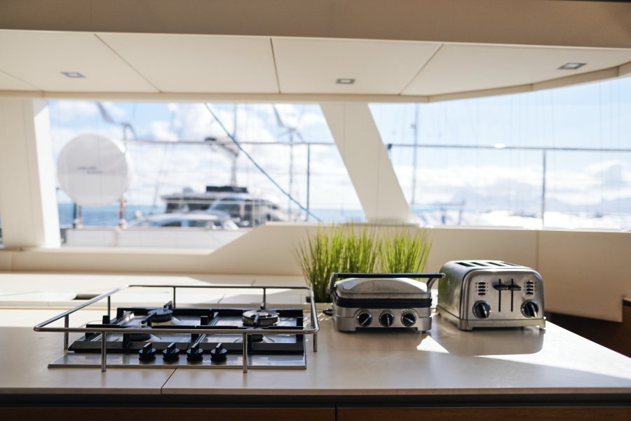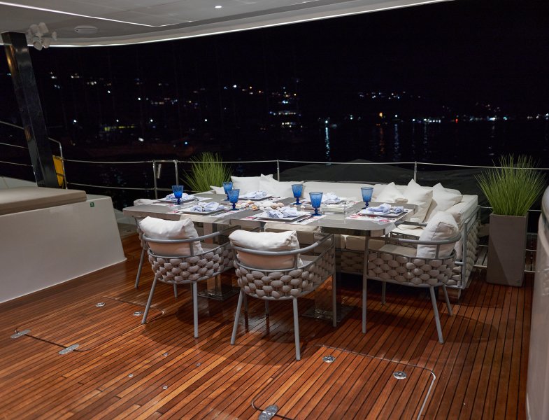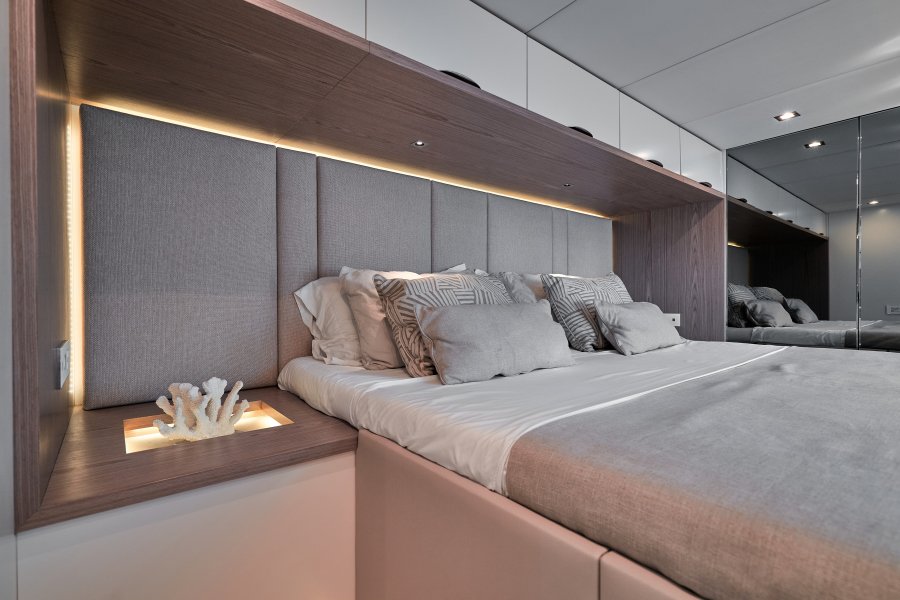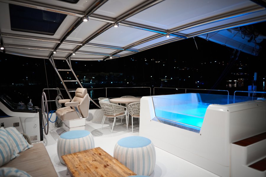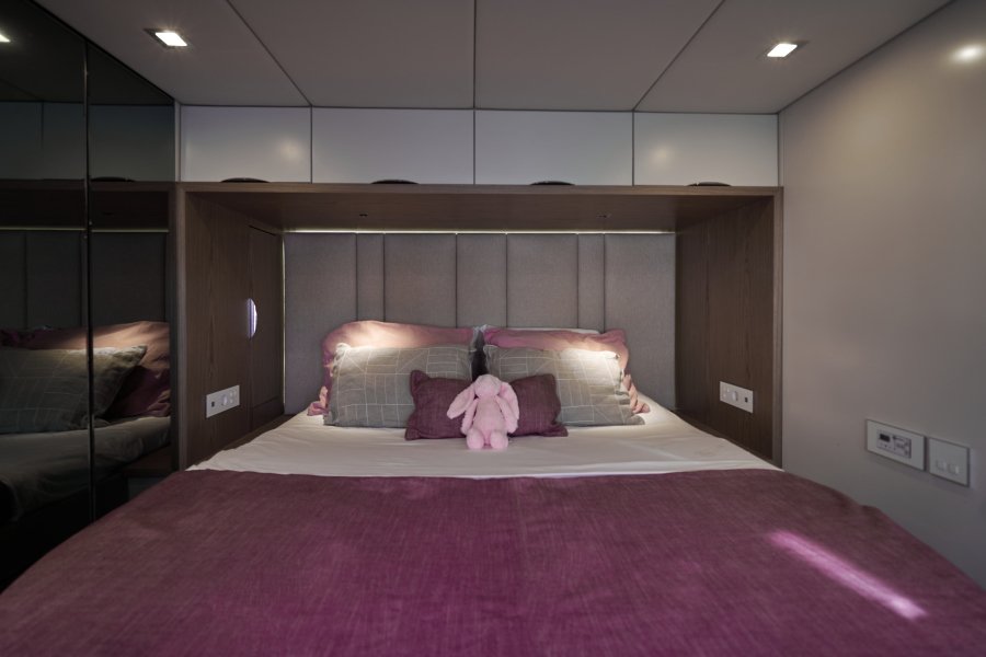 Her layout is perfect for chartering up to 8 guests + 3 crew or large live-aboard families, comprising of 1 Master cabin, 3 guest cabins, and a crew cabin, all en-suite with beautiful finishing. An air conditioned bow crew cabin permits a 3rd crew member.
