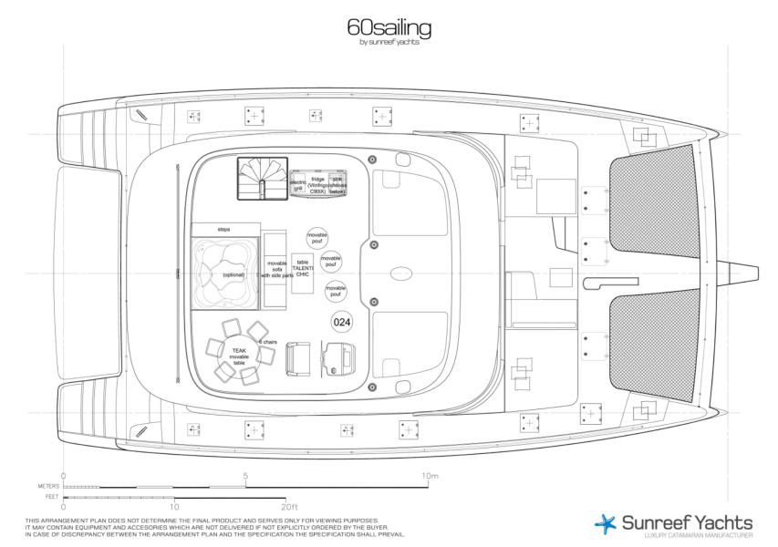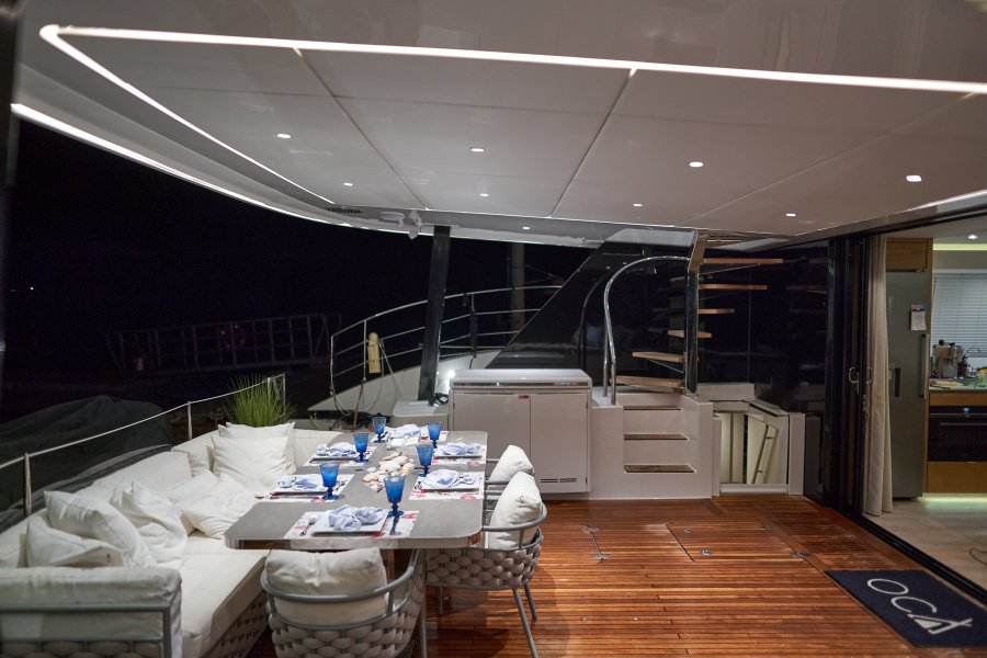 • Flybridge module with fridge, trash bin, electric BBQ grill and sink