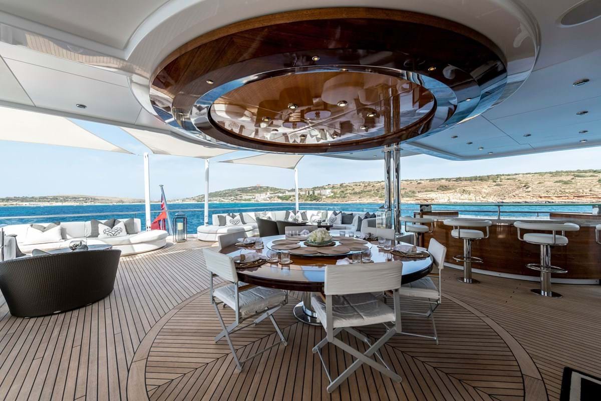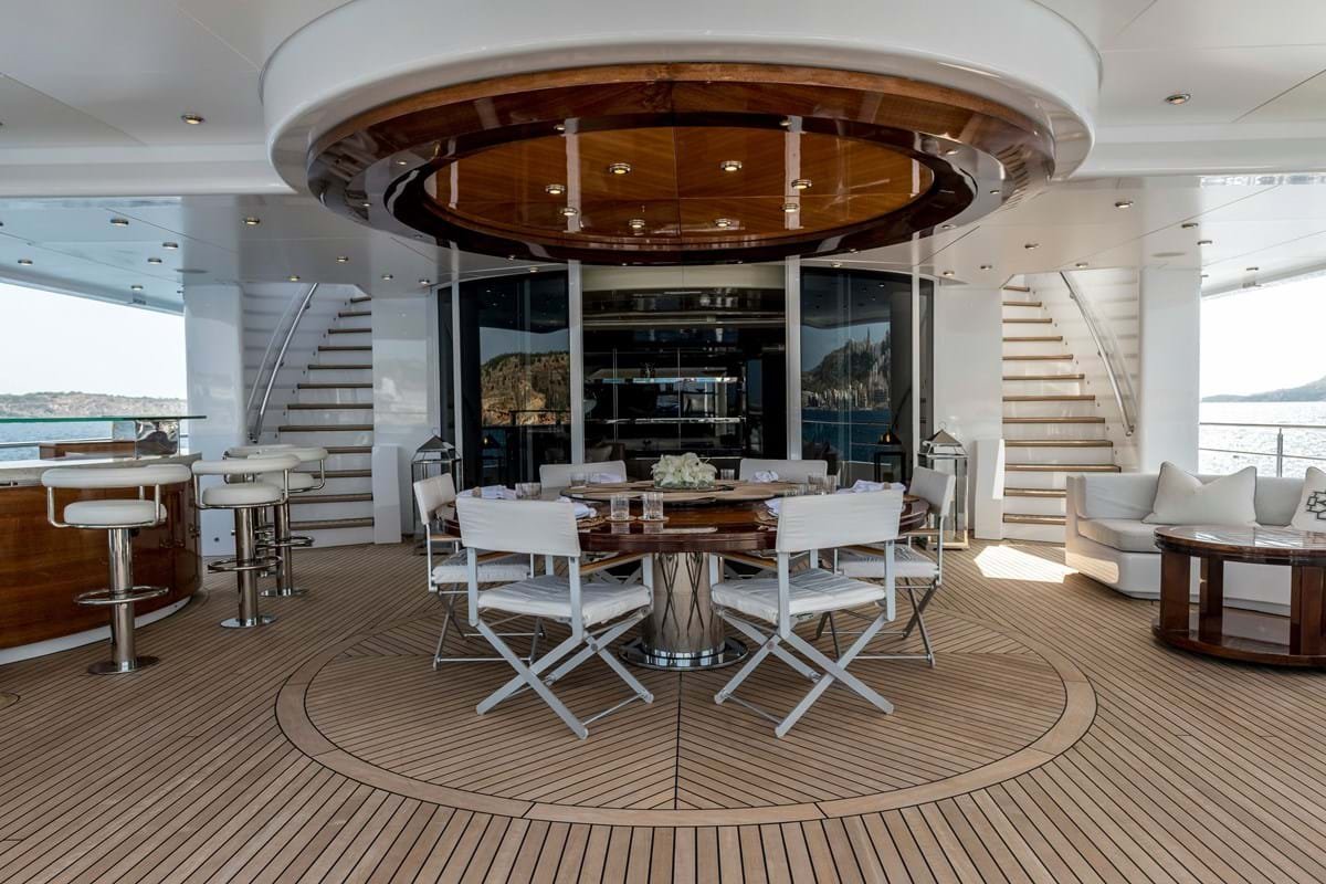 Her sun deck has a large glass-backed jacuzzi forward flanked by sunpads, a sit-up bar, day bed and dining beneath the hardtop and plenty of sunpads. There is more open-air dining, also served by a sit-up bar, on the spacious upper deck aft with two L-shaped sun lounges beyond the overhang. Walkaround sidedecks enable guests to immerse themselves in their surroundings.