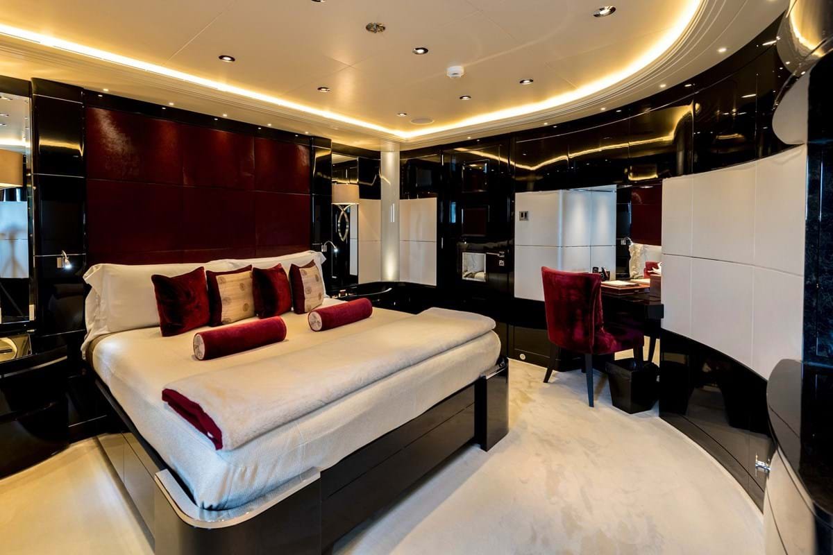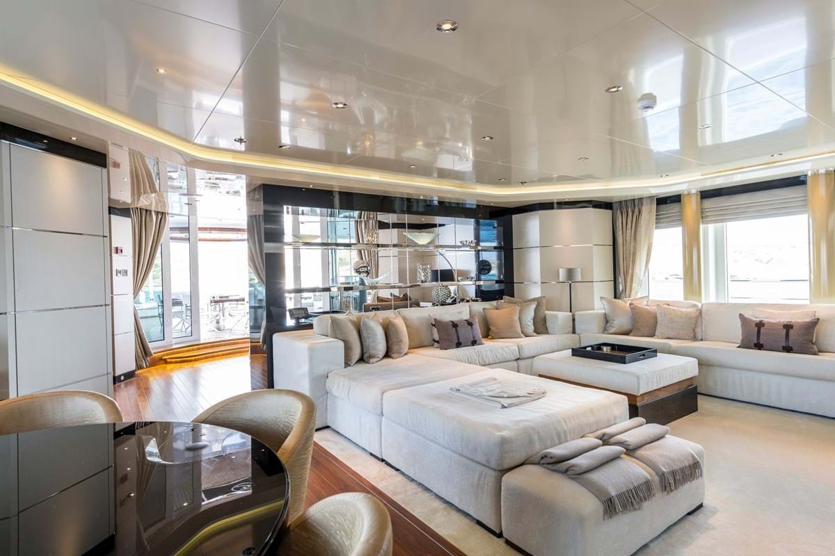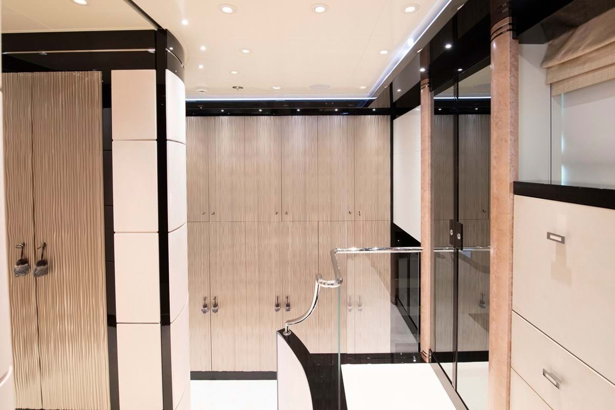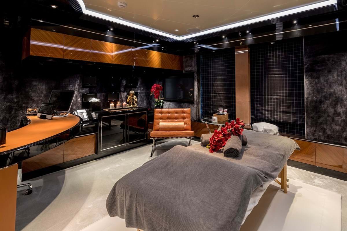 There is a dayhead off the main lobby and a gym and wellness area with massage table and beauty salon to starboard off a corridor leading to the VIP and owner’s suites. Spiral stairs wind around an intricate glass sculpture brought to life by natural light from a sun deck skylight.