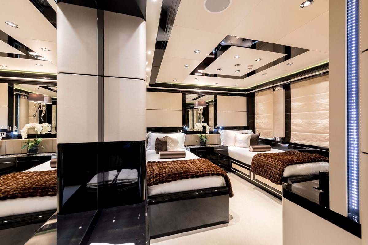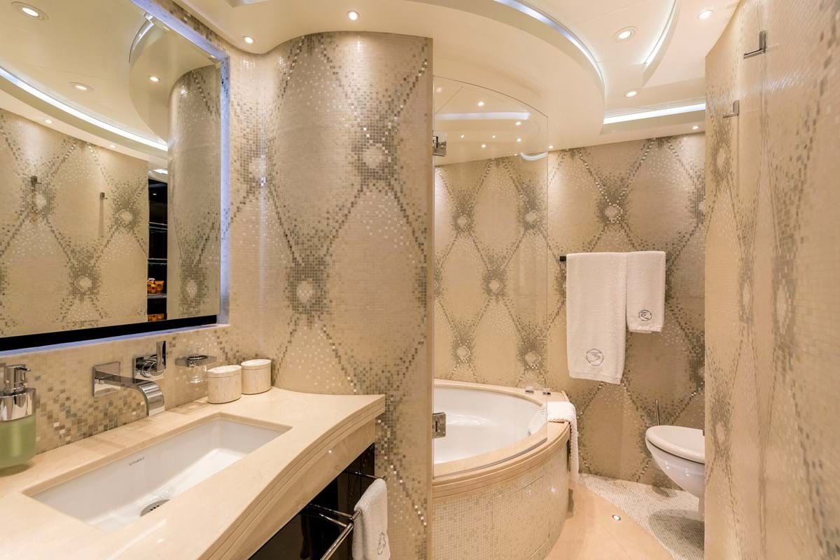 TALISMAN C welcomes 12 guests in six cabins. The owner’s suite is forward-facing on the main deck and has a boudoir décor with voile curtains around the king-sized bed, and crystal chandeliers as bedside reading lights. An en suite shows off glossy two-tone wood veneers and gold mosaic tiles around a spa bath and shower room. There’s a huge walk-in wardrobe and an owner’s private library (which can be converted to an additional cabin). The VIP suite is aft of the owner’s suite. On the lower deck the rest of the guest cabins are no less stylish, with two twin cabins and two double cabins also have spa bath en suites.