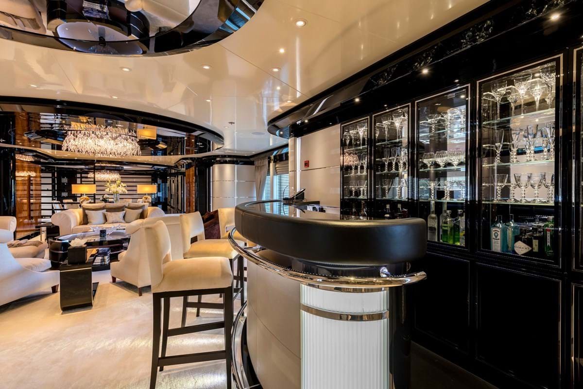 From the main deck aft, curved sliding glass doors lead into a fully equipped bar area with club seating, a saloon with sofa and armchair seating around a coffee table and a formal dining area with a feature glass-thread chandelier.TALISMAN C Motor yacht for sale