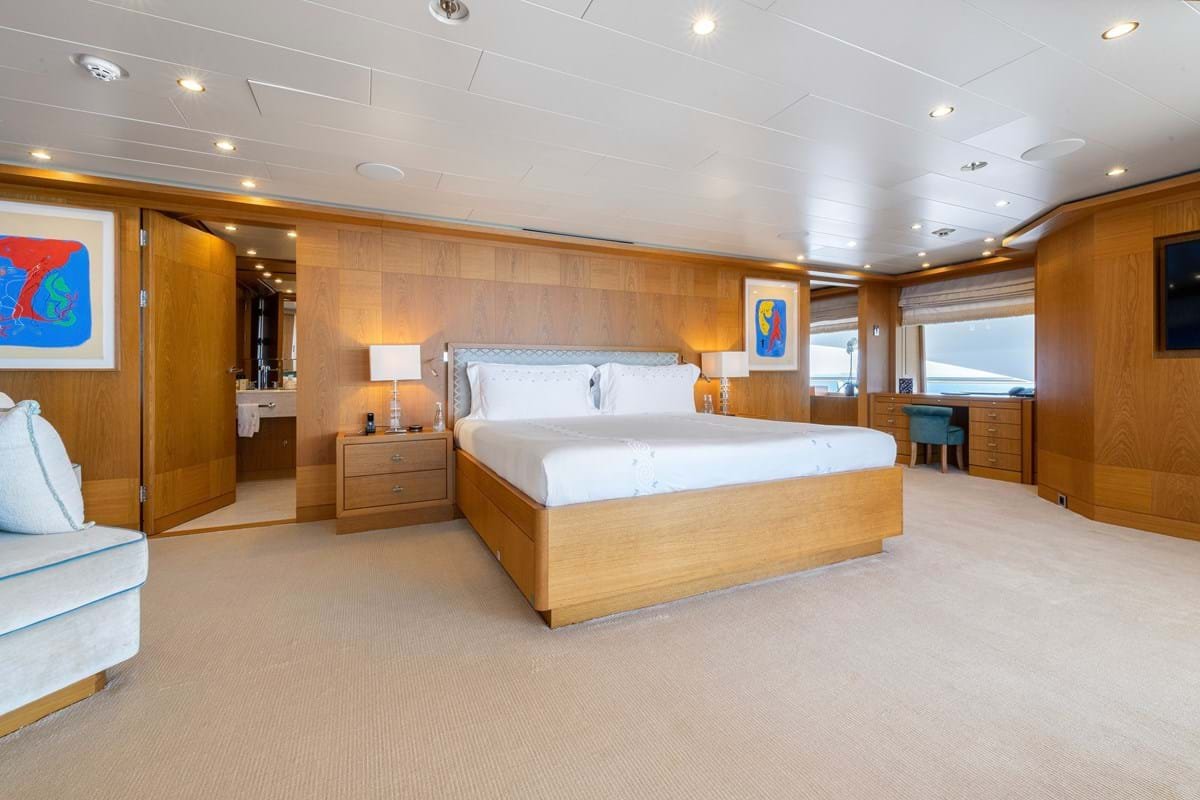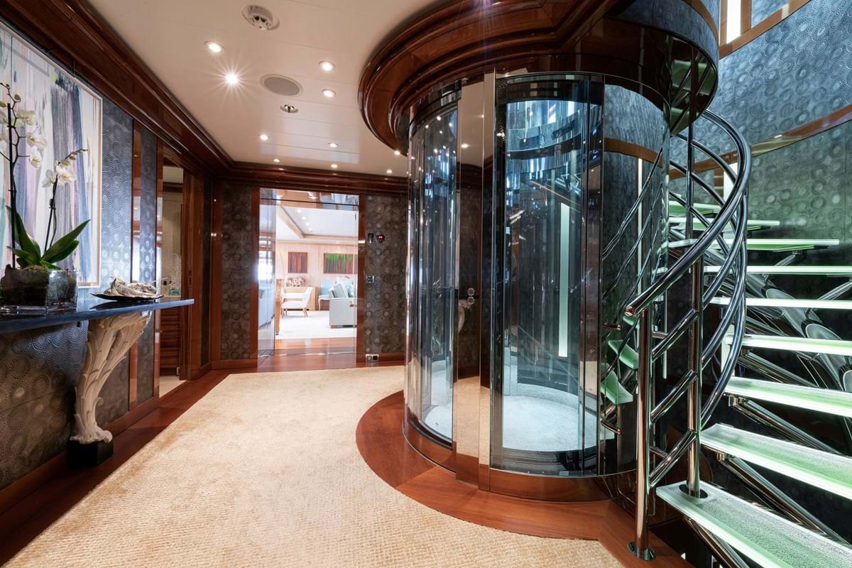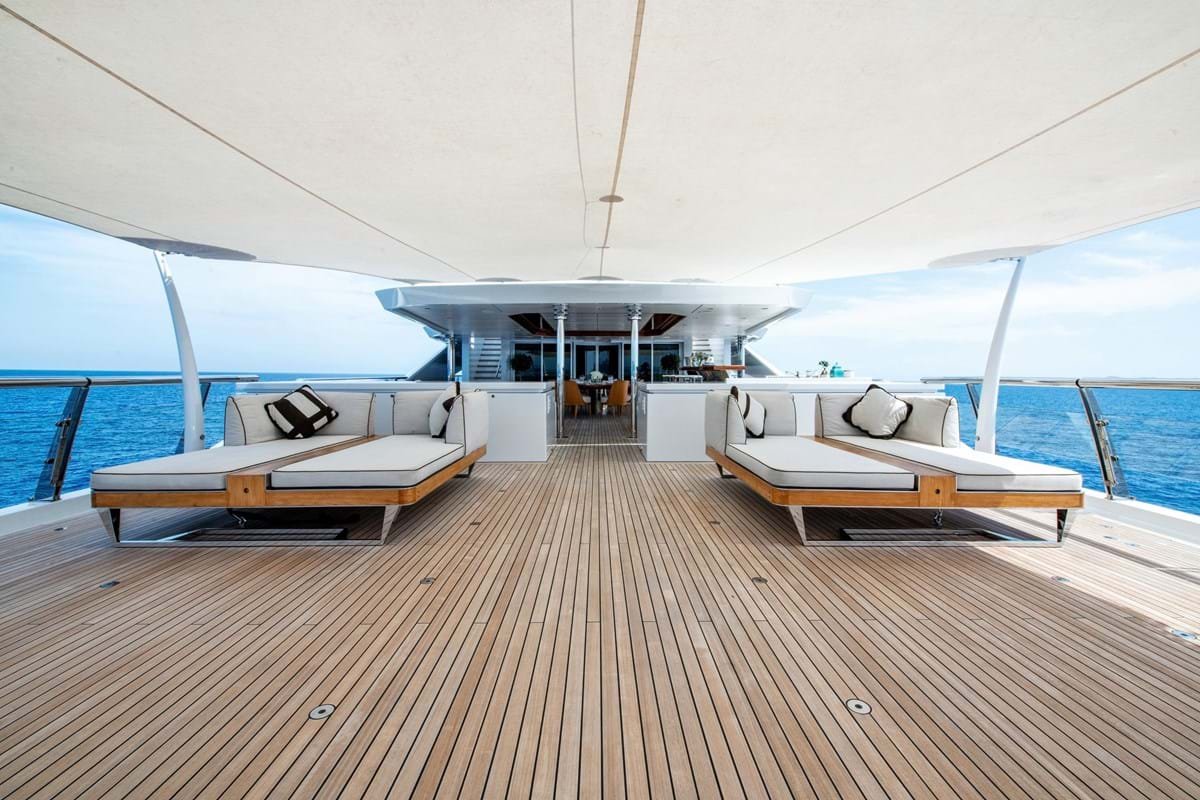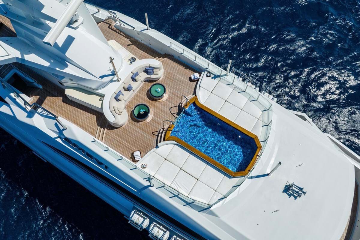 The upper deck has a VIP cabin, with en suite. A central staircase runs to the main deck aft where internal steps either side lead down to the swim platform, shower, dayhead and dressing room. The main deck is also walkaround and guests moving forward pass the boat deck where two 9.5m (31.2ft) tenders are launched on horizontal davits. There is also a full-beam tender and toy garage aft on the lower deck.