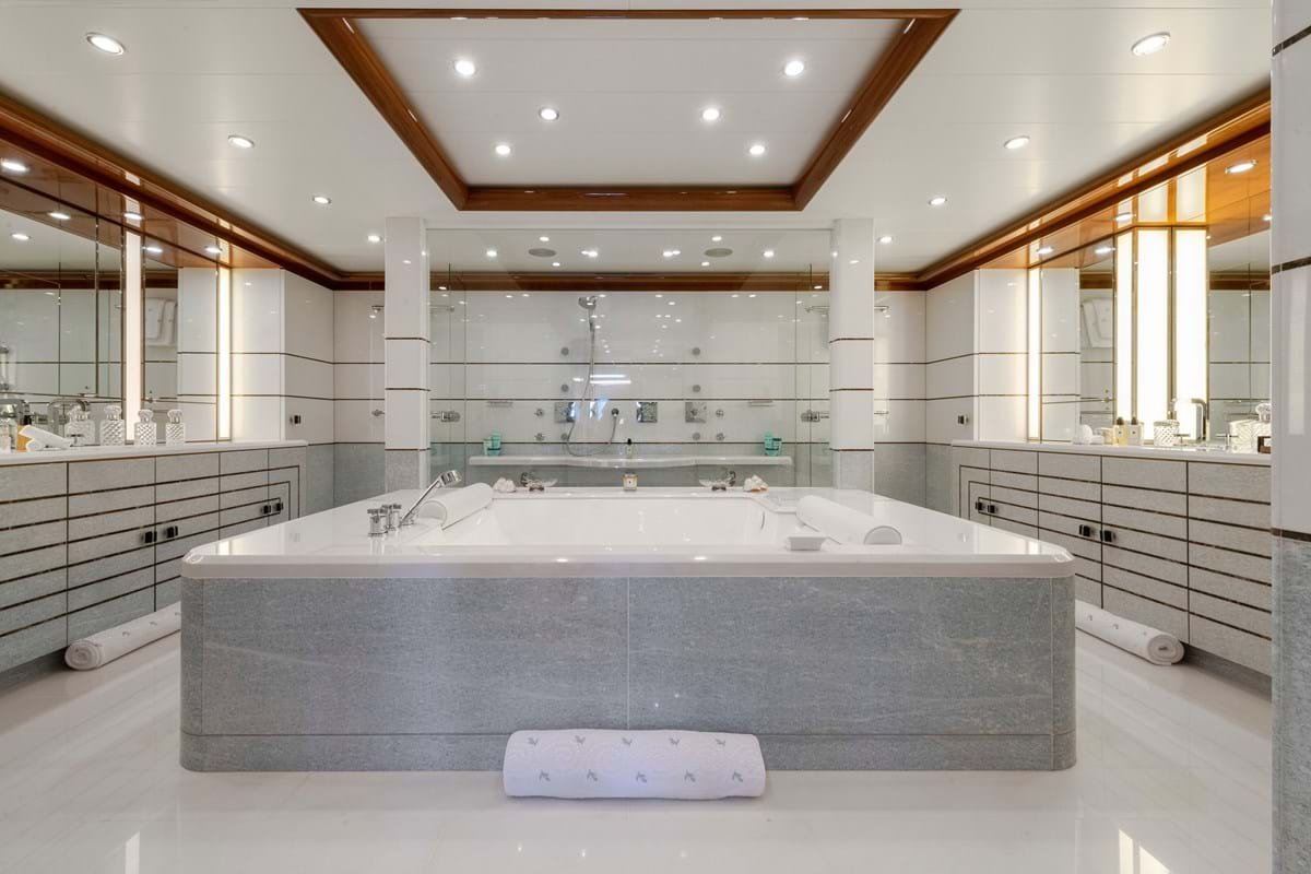 She welcomes up to 18 guests in nine suites. The owner’s suite takes up almost half of the upper deck’s interior. It features a private owner’s lounge with office, his-and-hers bathroom around a huge central bath, very large walk-in wardrobe and a bedroom with access to a Portuguese bridge and private terrace with two jacuzzis. The main deck has three VIP suites and two twin suites, and there are a further two double suites on the lower deck forward of the lobby, which has its own sea terrace. She also sleeps 22 crew.