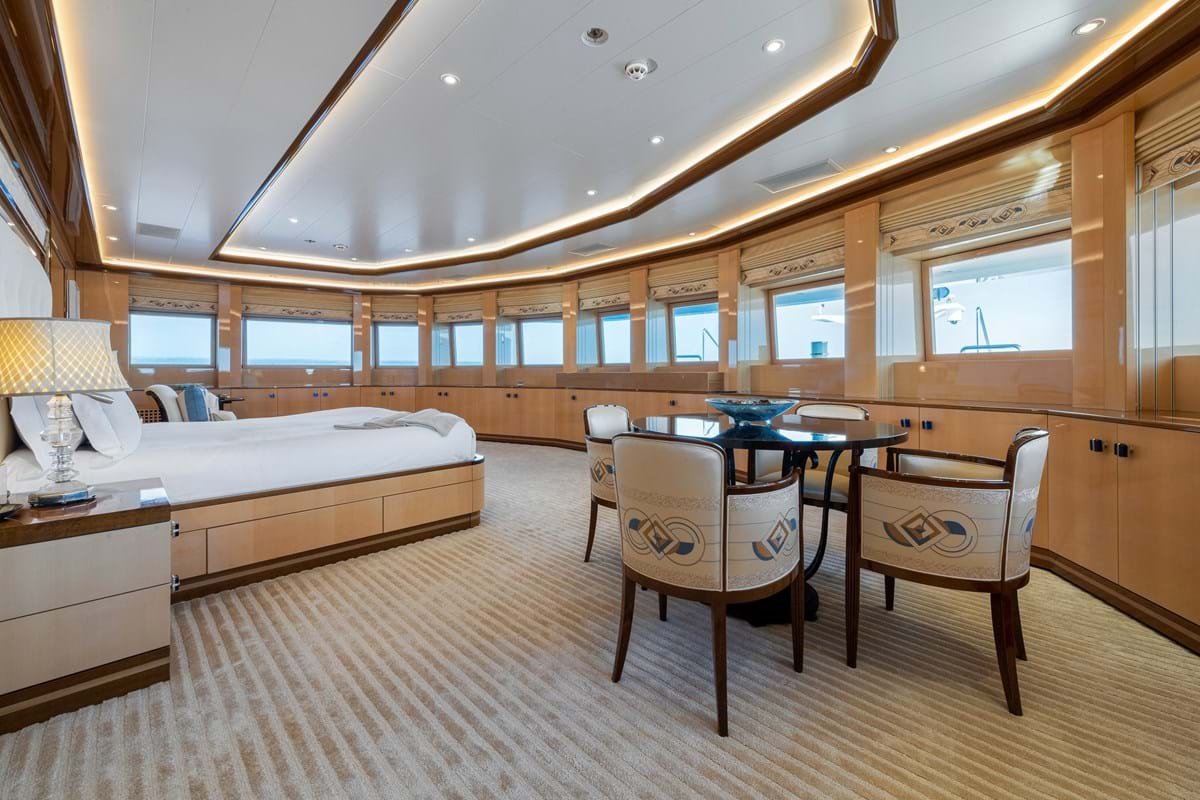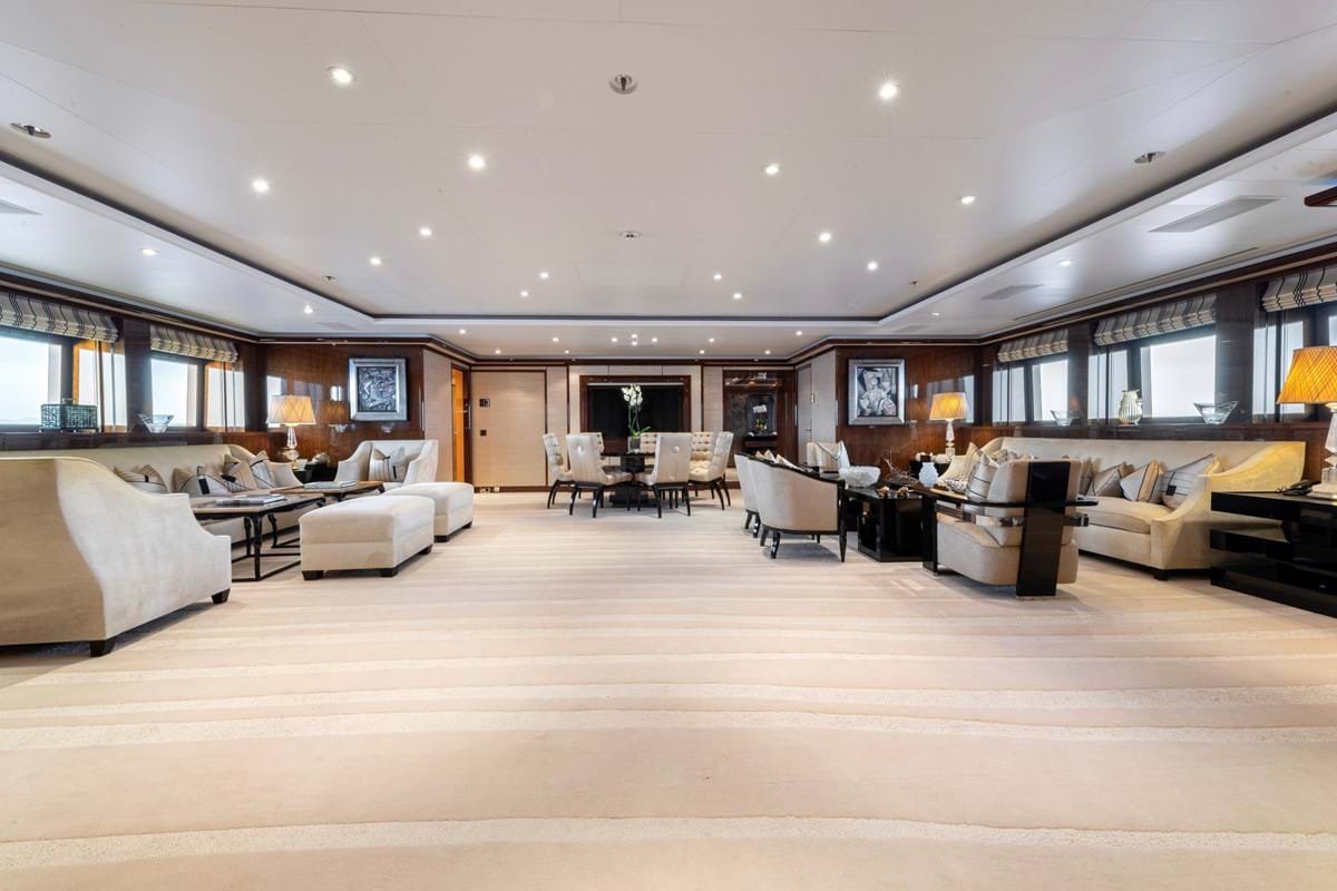 The bridge deck sky lounge has light wood panelling with marquetry and relaxed sofa seating. The upper deck is an entertainment space with convivial lounge seating and a piano in the lounge and a circular dining table for 20 guests with stunning views through a semi-circle of sliding glass doors, opening onto the upper deck aft.